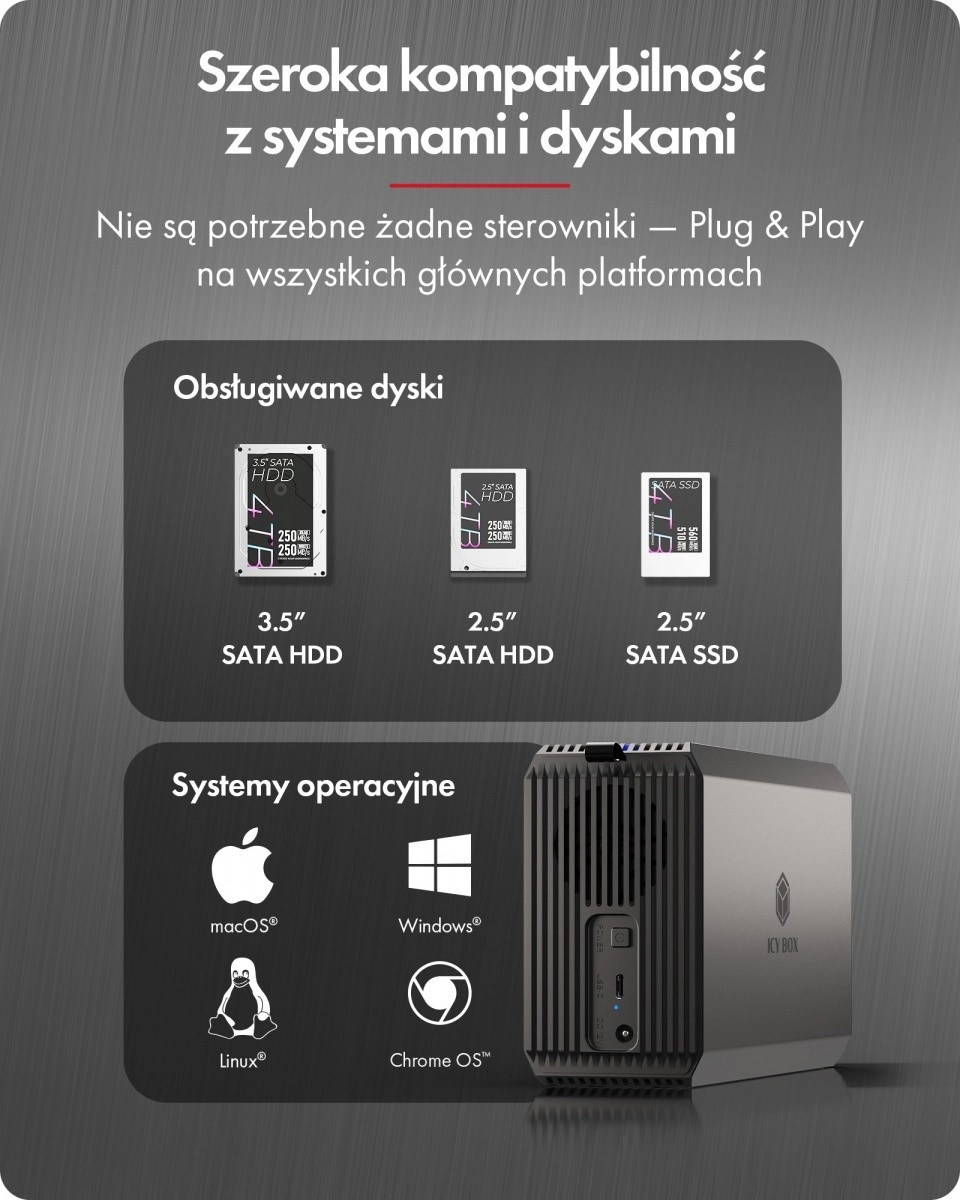 - Akár 60 TB kapacitás két 2,5"/3,5" SATA HDD/SSD foglalatban