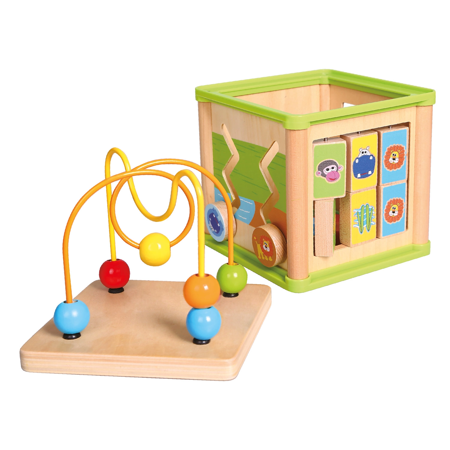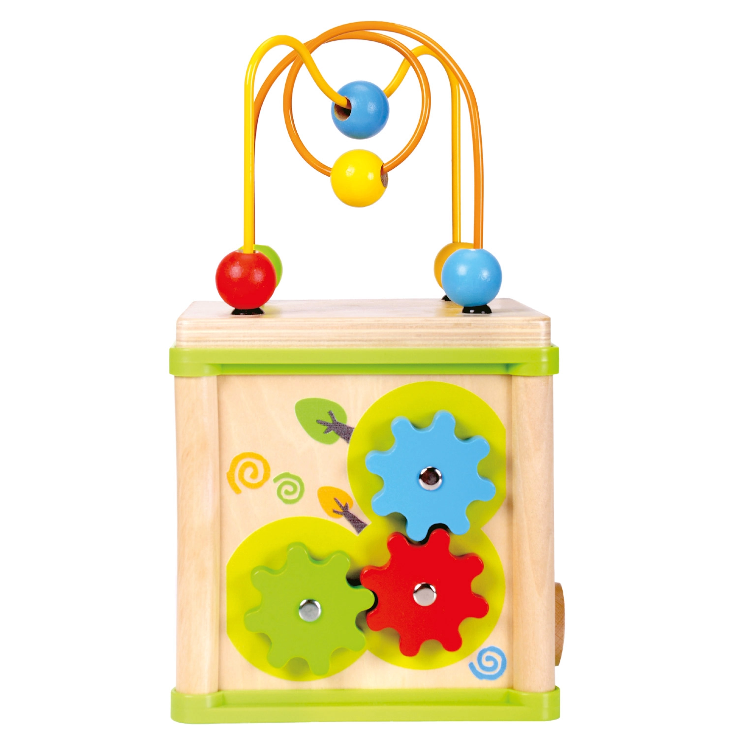 Ez a sokoldalú fa aktivitási kocka öt vonzó játékelemet egyesít kompakt kivitelben. A gyerekek párosíthatják az állatokat az eleségükkel, végigvezethetik a gyöngyöket a kanyargós pályákon, felfedezhetik a fogaskerekek működését, vagy gyakorolhatják a formabedobót. A felső rész egy gyöngylabirintus, amely támogatja a kéz–szem koordinációt és a koncentrációt.