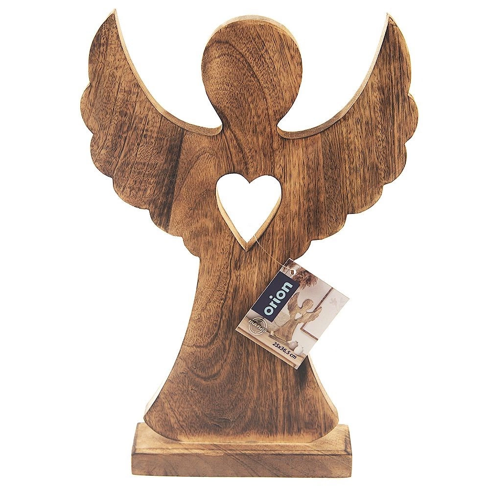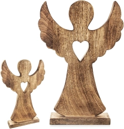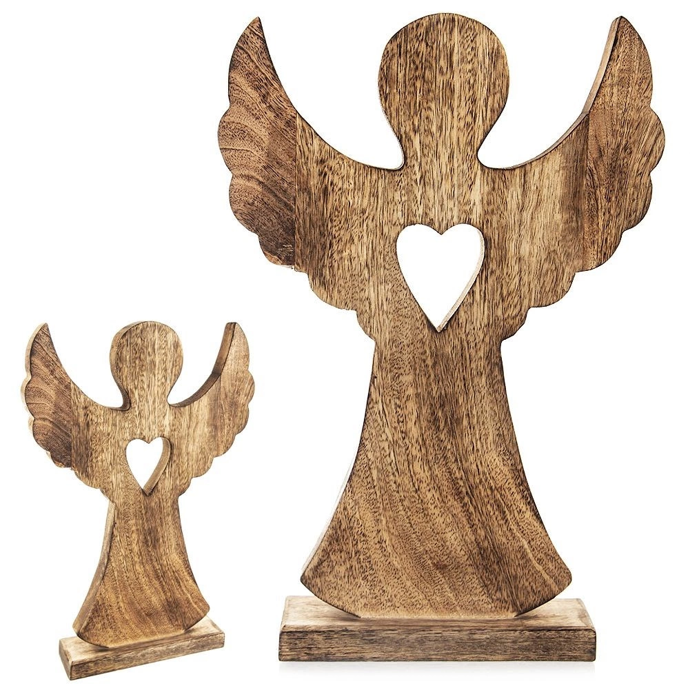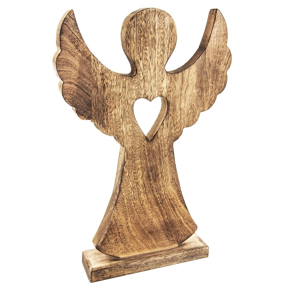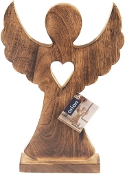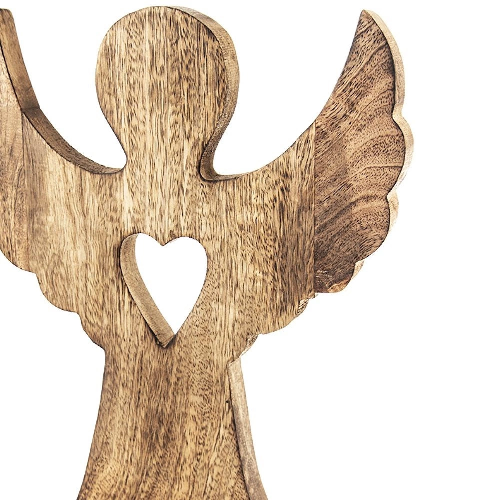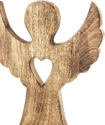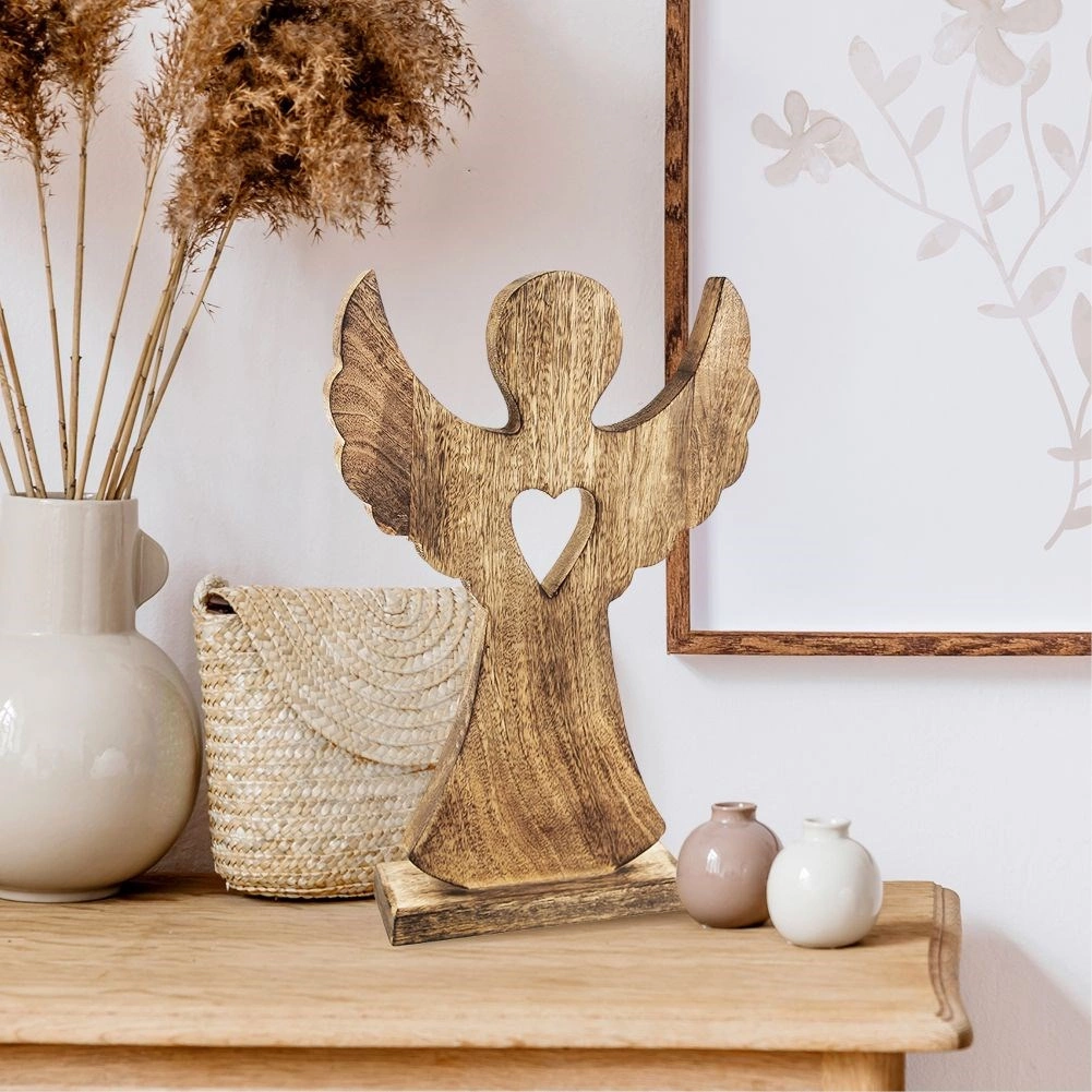 A természetes mangófából készült dekoratív angyal a fa erezetével és letisztult vonalaival tűnik ki. A szív alakú kivágás finom, egyedi akcentust ad, amely illik modern és hagyományos enteriőrbe egyaránt. A stabil téglalap alakú talapzat biztonságos elhelyezést biztosít polcon, komódon és ablakpárkányon.