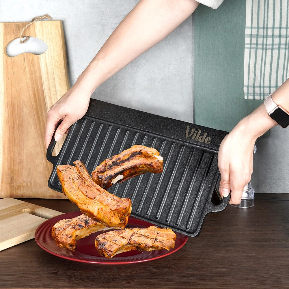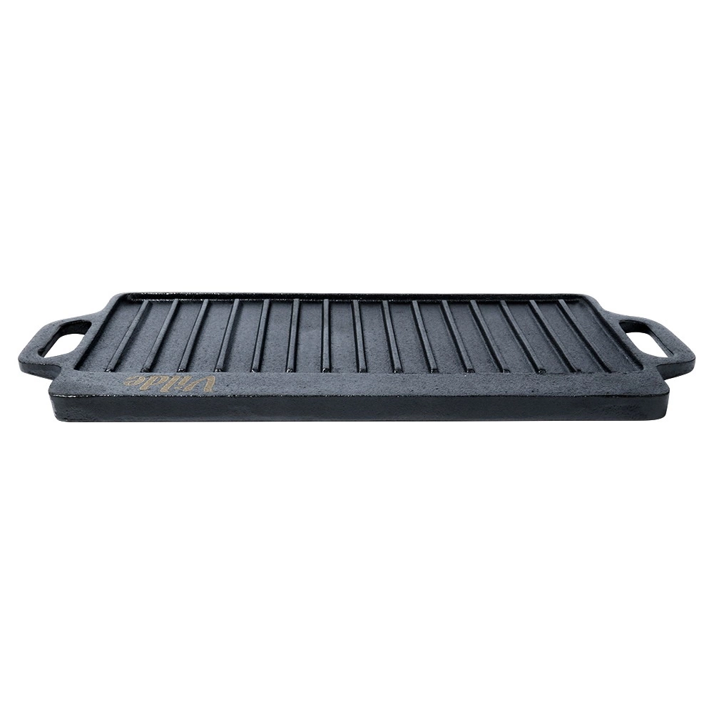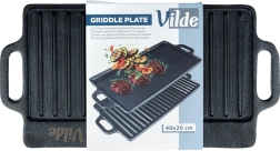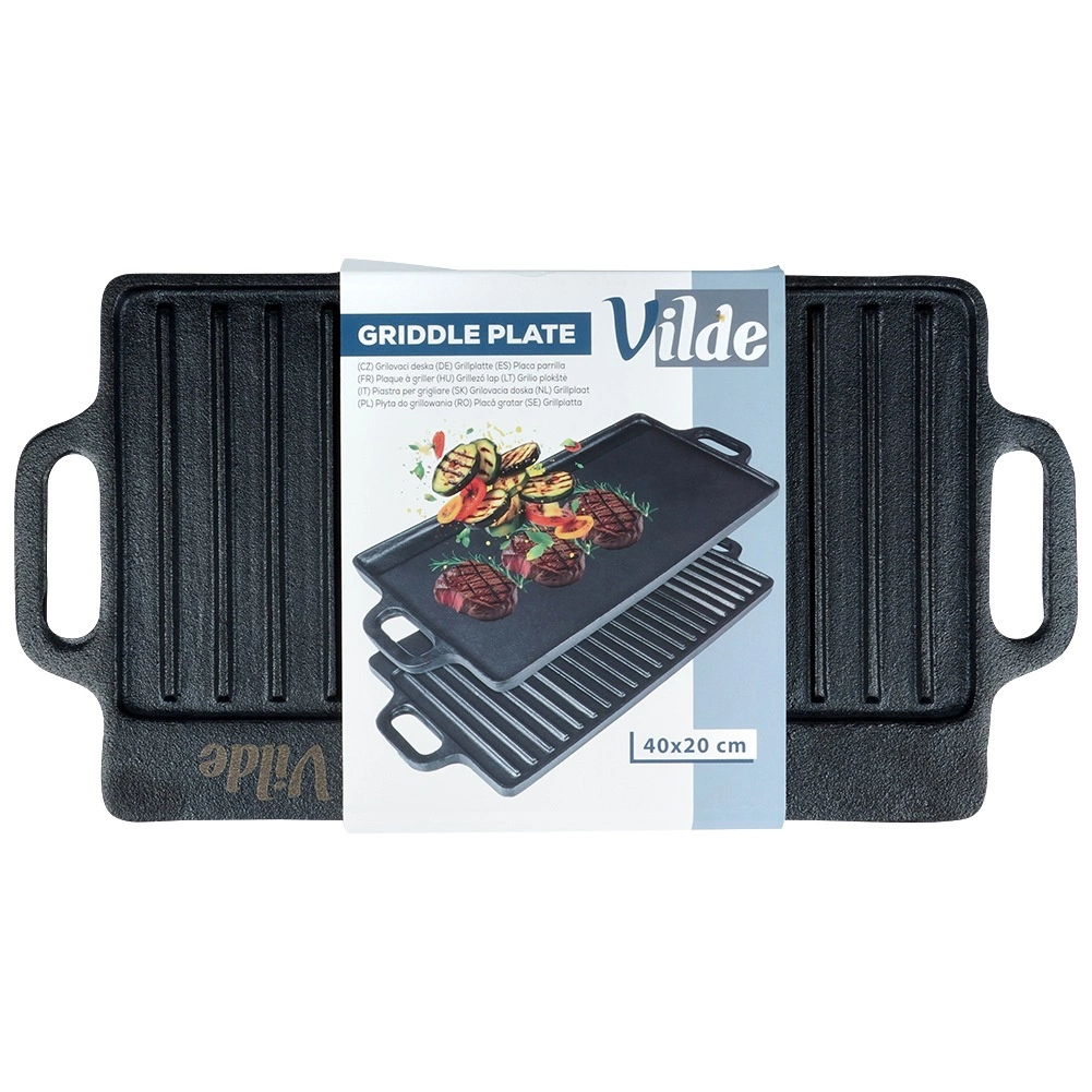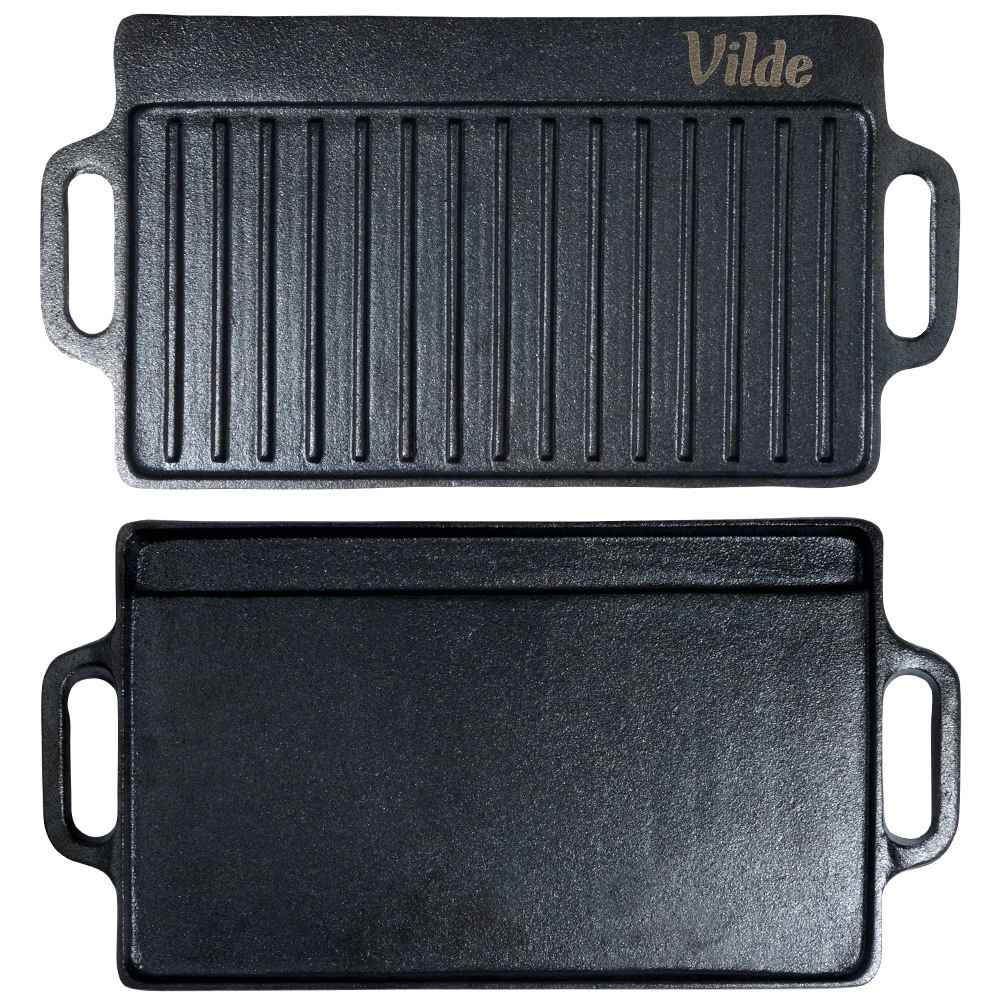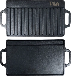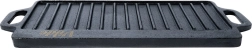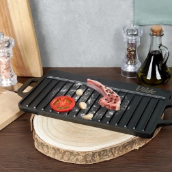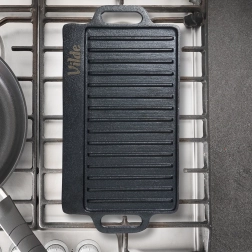 Kétoldalas öntöttvas grilllap 40 × 20,5 cm méretben, tökéletes steakhez, halhoz és zöldségekhez. A masszív anyag kiválóan felhalmozza a hőt, egyenletesen eloszlatja, és markáns rácsnyomatot hoz létre a grillezett ételeken. Az egyik oldal simított sütéshez és pirításhoz, a másik bordázott a grillezéshez és a zsír elvezetéséhez. Használható tűzhelyen, sütőben és grillen is.