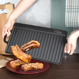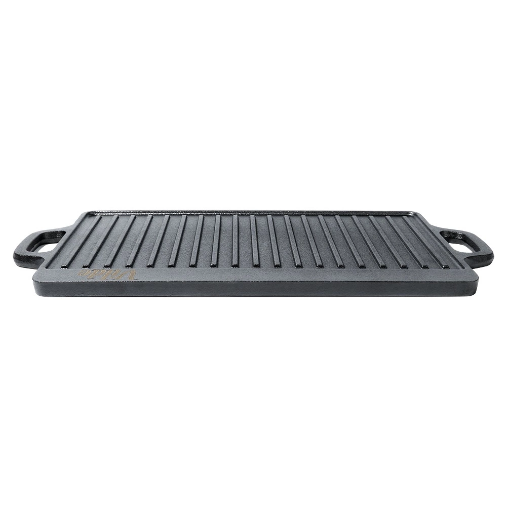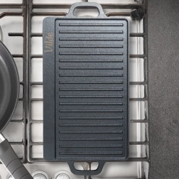 Ez a masszív öntöttvas lap ideális húsok, halak, zöldségek és steakek grillezésére. A kétoldalas kialakítás maximális rugalmasságot nyújt: a sima oldal palacsintához, tojásokhoz vagy burgerekhez, a bordázott oldal karakteres rácsnyomokhoz és a zsír elvezetéséhez. Az öntöttvas magas hőtehetetlenségének köszönhetően stabil hőmérsékletet tart és egyenletes átsülést biztosít.