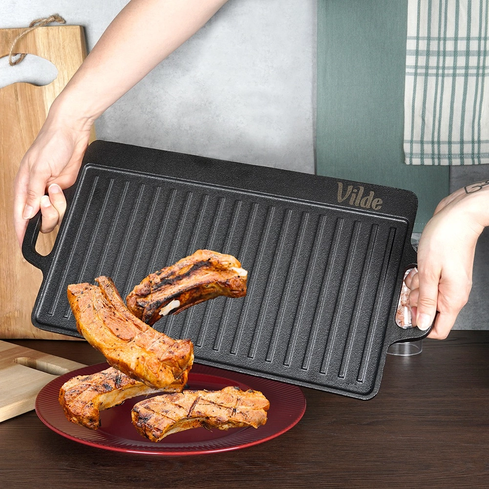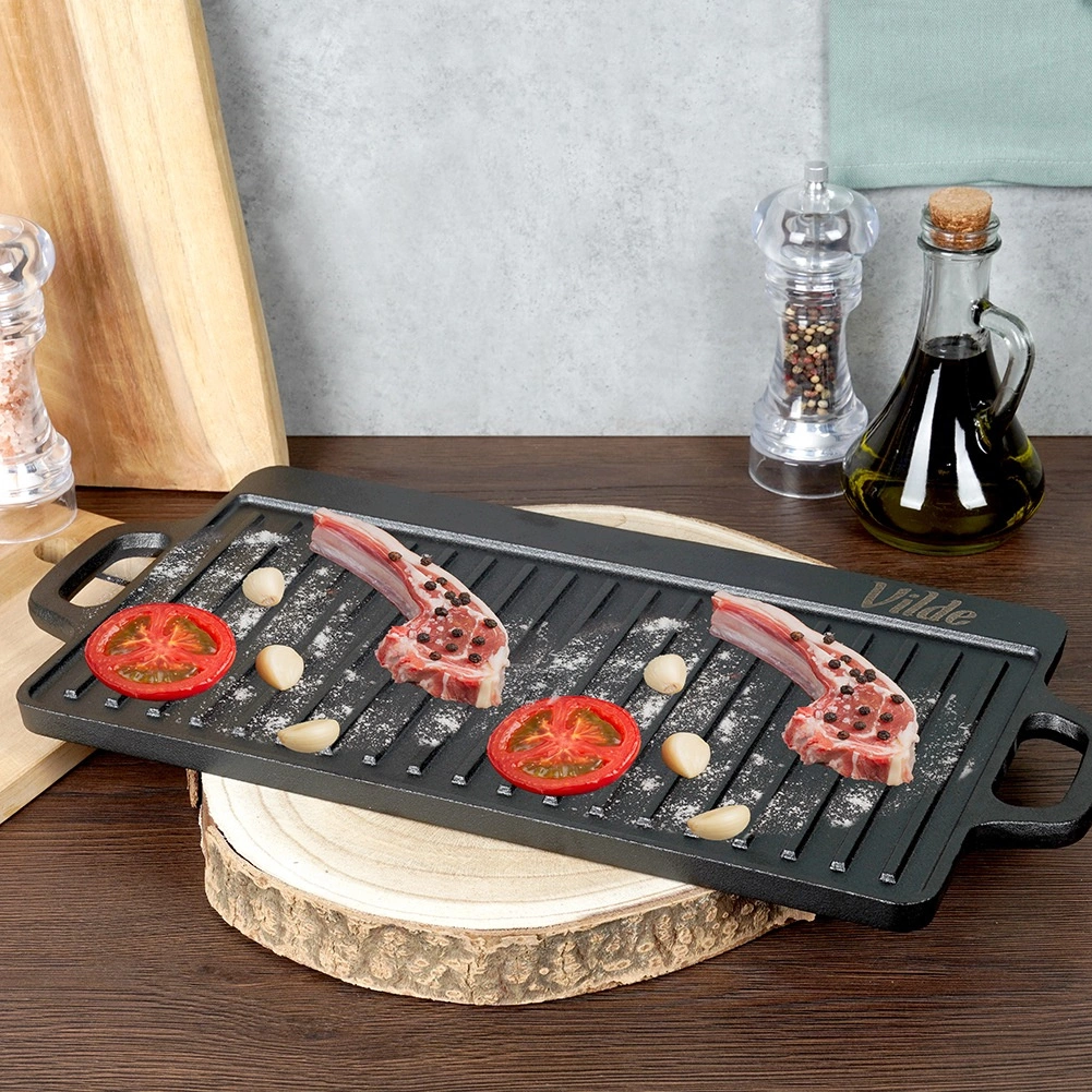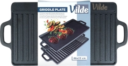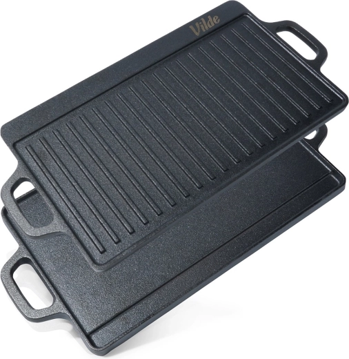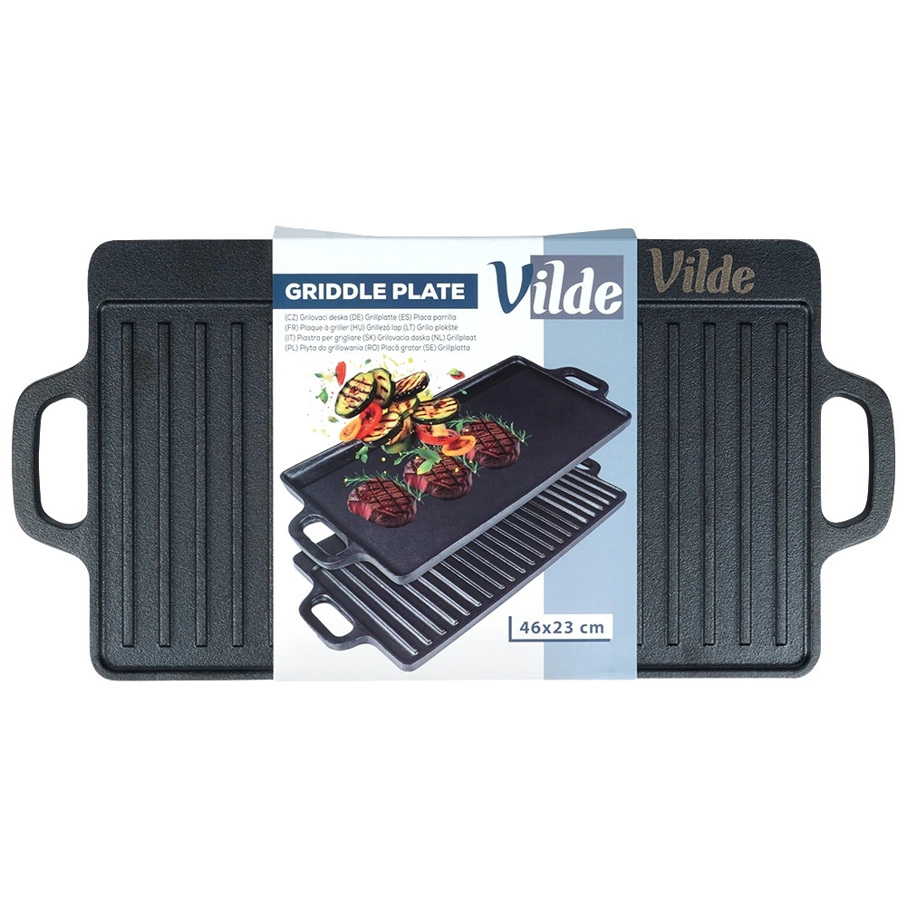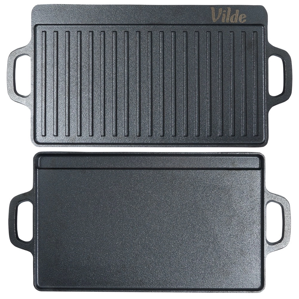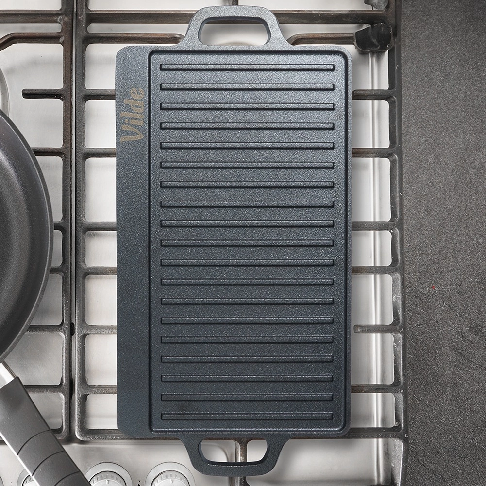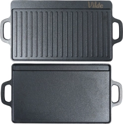 A tartós, kétoldalas VILDE CAST LINE öntöttvas grilllap 45,5 × 22,5 cm méretben egy simított és egy bordázott felületet kínál a sokoldalú főzéshez. Az öntöttvas egyenletesen melegszik fel, kiválóan tartja a hőt, és alkalmas tűzhelyre, sütőbe és grillre is.