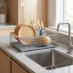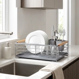 Tartsa konyháját mentesen a vizes foltoktól és a rendetlenségtől. Ez az elegáns, szürke edényszárító a robusztus fémkivitel előnyeit praktikus, mindennapi használatra szánt megoldásokkal ötvözi. A kivehető csepegtetőtálca felfogja a vizet és szárazon tartja a munkafelületet, míg a kétrekeszes evőeszköztartó igény szerint a belső vagy a külső oldalra helyezhető.