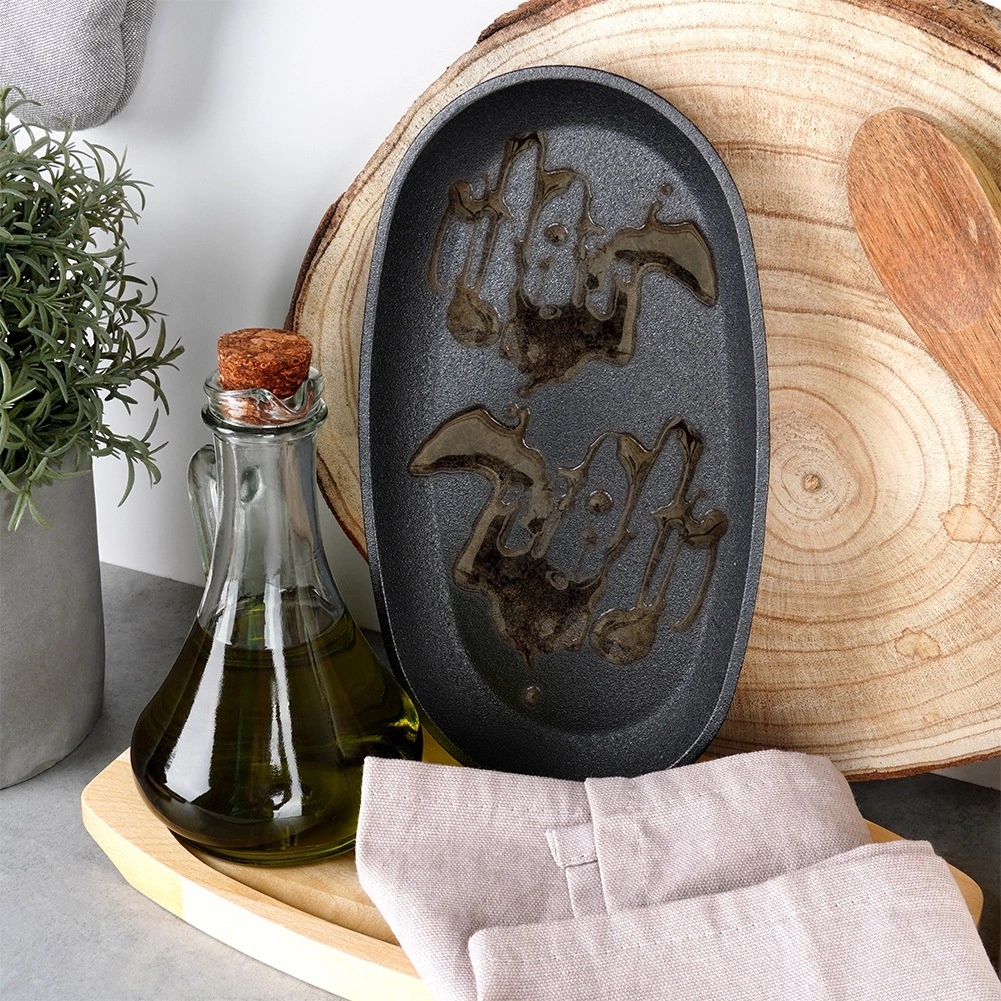 Ez az ovális öntöttvas serpenyő 24 × 14 × 2 cm méretben levehető nyéllel és masszív fa táblával (28 × 19 cm) ideális grillezéshez, sütéshez, pirításhoz és tálaláshoz. Az öntöttvas egyenletesen melegszik fel és kiválóan tartja a hőt, így a hús, a zöldségek vagy a burgonya szaftosak és forrón tálalhatók.