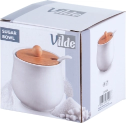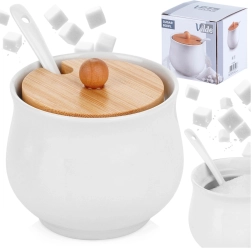 Elegáns fehér cukortartó bambusz fedéllel és kerámia kanállal, ideális a mindennapi tálaláshoz. 250 ml kapacitással, kivehető, kanálnyílással ellátott fedéllel és tartós kerámia kivitelben, amely tovább frissen és tisztán tartja a tartalmat.