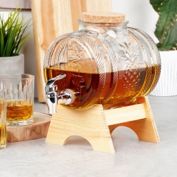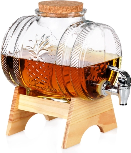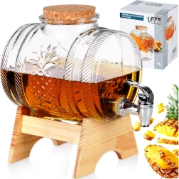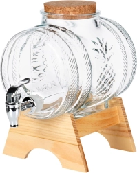 Elegáns, 3 literes üveg italkiöntő állvánnyal, ideális limonádé, gyümölcslé vagy jeges tea felszolgálásához. Hordó formájú, ananász mintás domborítással, praktikus csappal a könnyű adagoláshoz, széles nyakkal a kényelmes töltéshez és tisztításhoz, valamint természetes parafa fedéllel, amely megóvja az italt a szennyeződésektől és a rovaroktól. A stabil bambusz állvány ideális magasságba emeli az edényt a kényelmes használathoz.