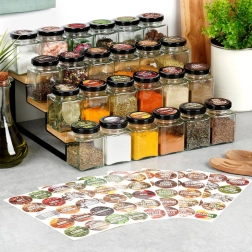 A 24 darab üveg fűszertartóból álló, címkékkel ellátott készlet a fűszereket és gyógynövényeket rendszerezetten és mindig kéznél tartja – a fióktól a konyhai állványig.