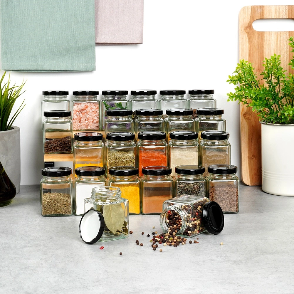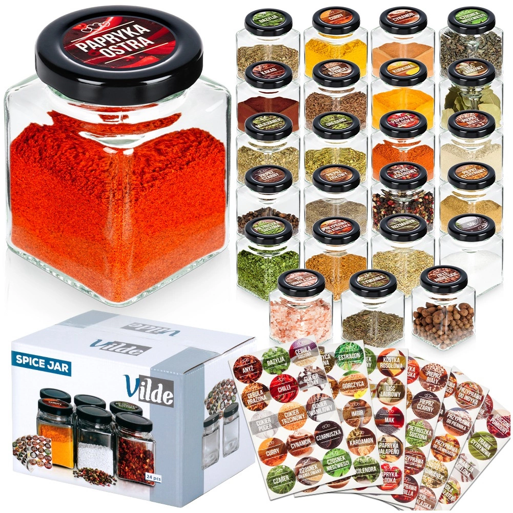 Teremtsen rendet és stílust a konyhában! A készlet 24 elegáns, négyzet alakú fűszertartót tartalmaz (5,5 × 5,5 × 7,5 cm, 100 ml) tiszta üvegből, fekete fém kupakokkal, amelyek megbízhatóan zárnak és védik a tartalmat a nedvességtől. A mellékelt öntapadós címkék a legnépszerűbb fűszerek és gyógynövények neveivel segítenek a tökéletes áttekintés fenntartásában.