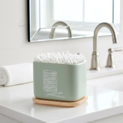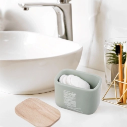 A GREENISH sorozat elegáns doboza rendezetten és higiénikusan tartja a fürdőszobát. A tartós szintetikus kőből készült masszív test hűen idézi a kerámiát, míg a természetes bambusz fedél megóvja a tartalmat a nedvességtől és a portól. Kompakt méretei bármely polcra vagy mosdóra illenek, mégis elegendő fültisztító pálcikát vagy vattakorongot képes befogadni.