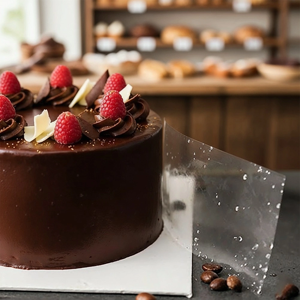 A fólia erős, rugalmas és élelmiszerbiztonságos, nem tapad a krémekhez, és lehetővé teszi a precíz, egyenes éleket mázak és tükörglazúrok felhordásakor. Kiválóan alkalmas csokoládé díszek formázásához is.