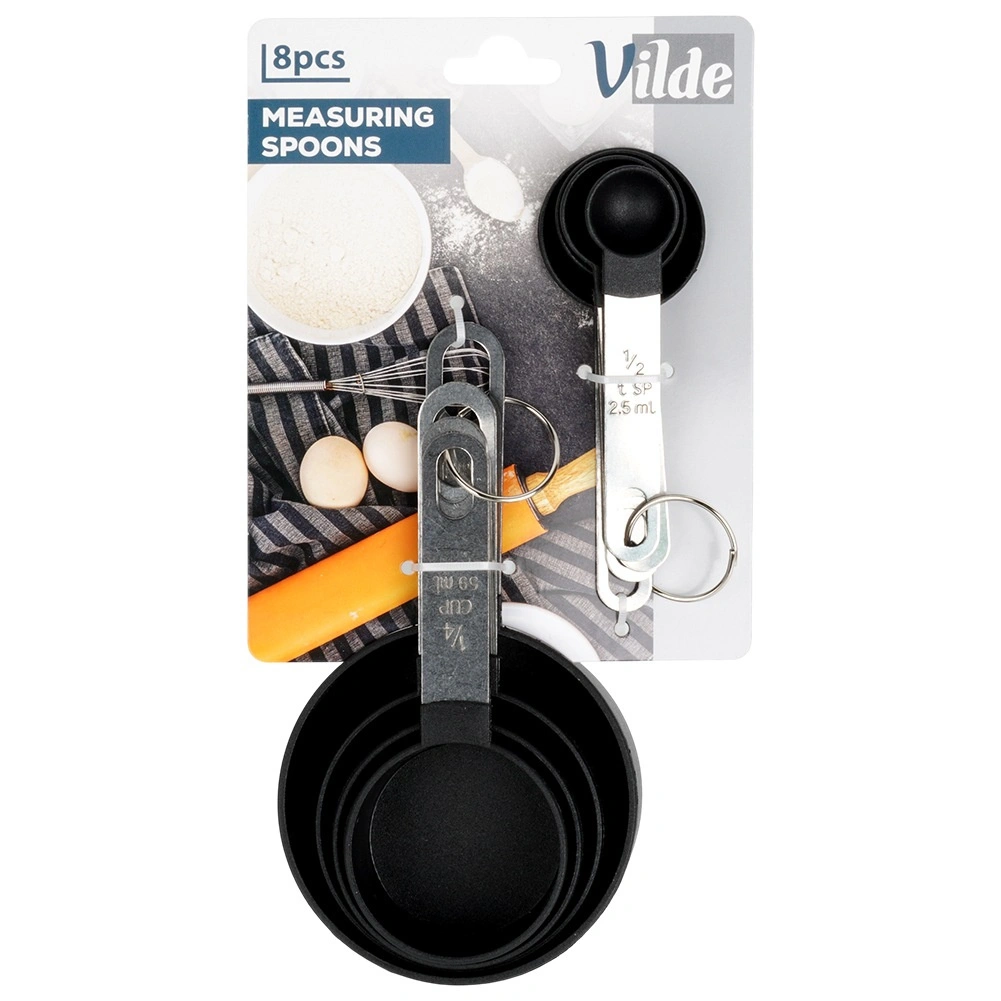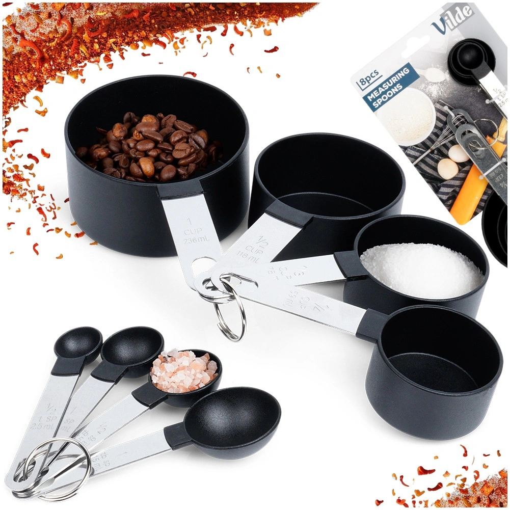Praktikus, 8 darabból álló fekete mérőkészlet a hozzávalók pontos adagolásához főzéshez és sütéshez. Tartalmaz mérőkanalakat és mérőcsészéket jól látható jelölésekkel. Tartós anyagok, mosogatógépben könnyen tisztítható, és helytakarékos gyűrűs tárolás – nélkülözhetetlen kiegészítő minden konyhába.