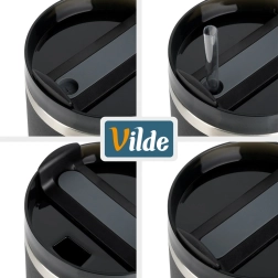 A forgó mechanizmussal és szilikon tömítéssel ellátott tető megakadályozza a szivárgást, és két ivási lehetőséget kínál: szívószállal vagy szívószál nélküli kiöntőn keresztül. A fül csúszásgátló elemei biztos fogást nyújtanak. A maximális hőmegtartás érdekében használat előtt javasolt a bögrét forró vagy hideg vízzel kiöblíteni, és körülbelül a kapacitás 90%-áig tölteni.