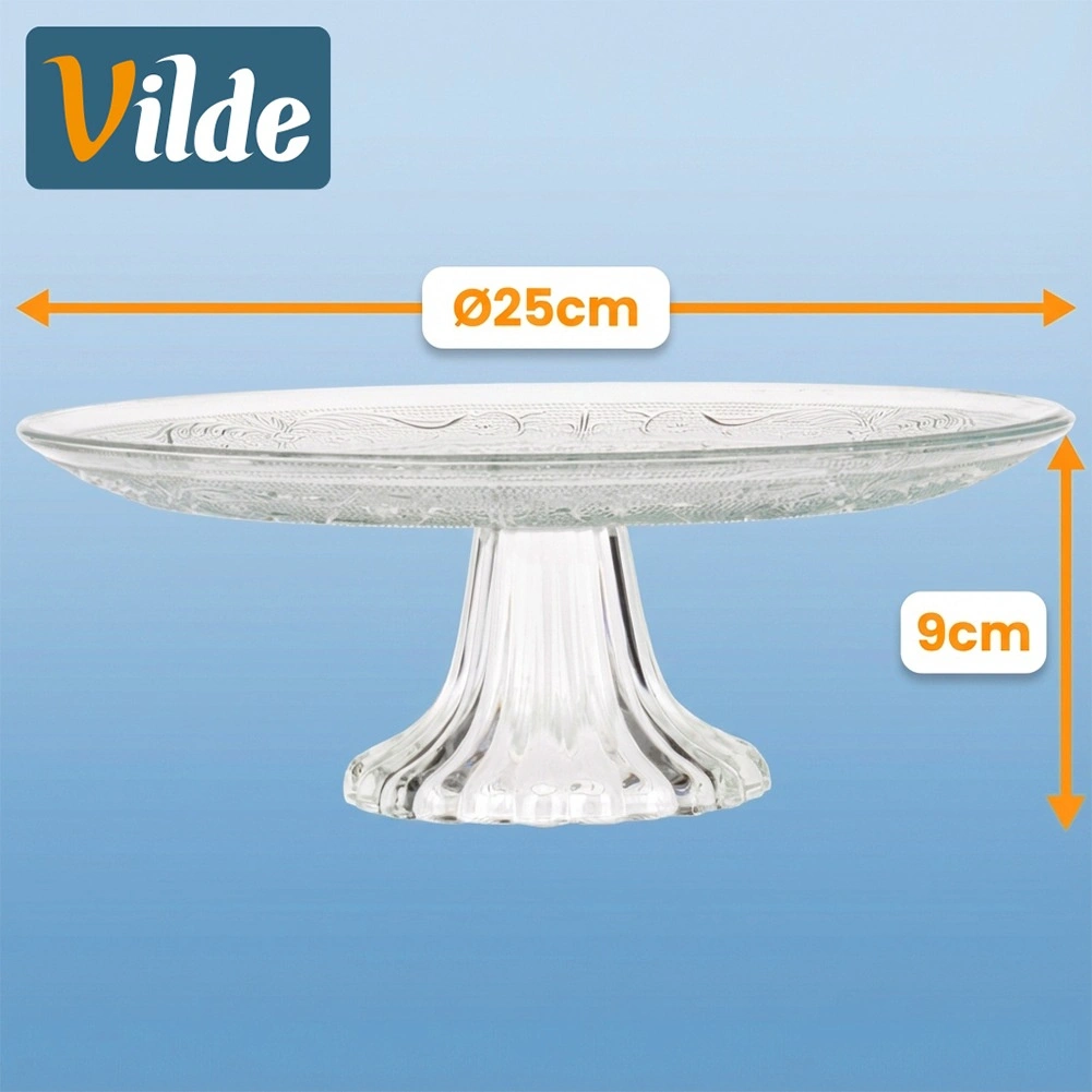 Elegáns üvegtortatál talppal, 25 cm átmérővel torták, piték és desszertek stílusos tálalásához. A díszített, átlátszó üveg kristályhatást kelt, és luxus megjelenést ad az asztalnak. A megemelt kialakításnak köszönhetően minden desszert kiemelkedik, a tál mosogatógépben mosható, és kiválóan alkalmas otthoni és professzionális használatra is.