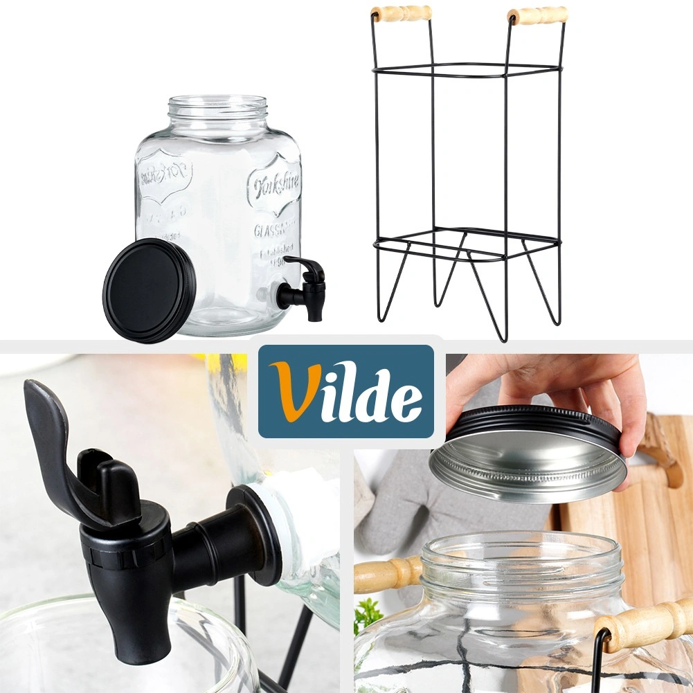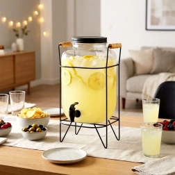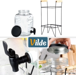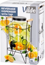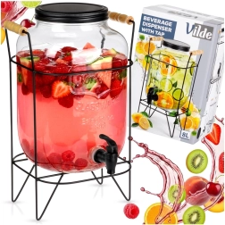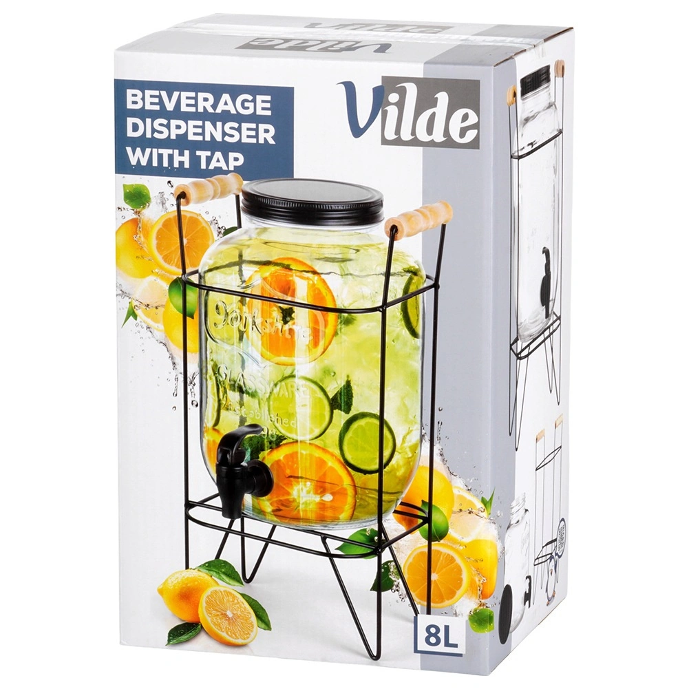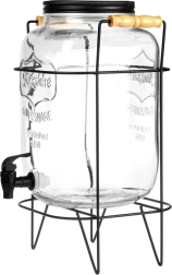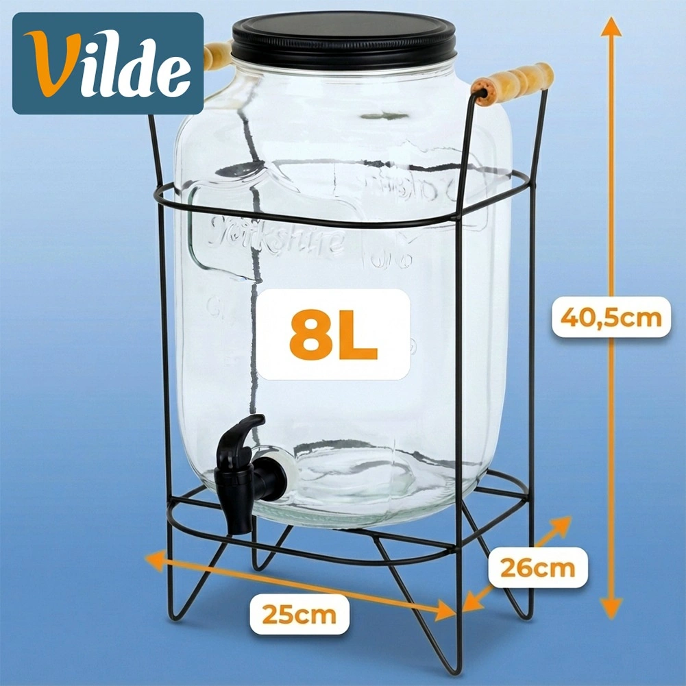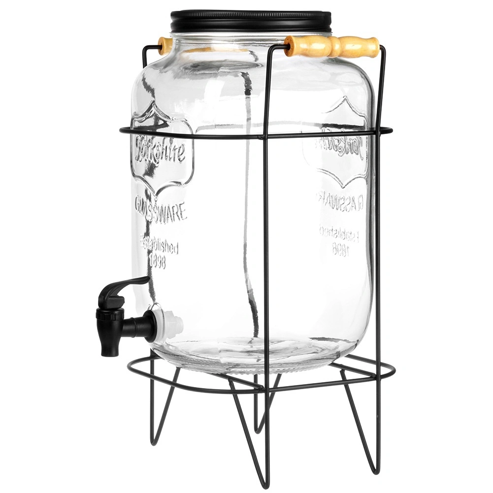 Elegáns üveg italadagoló 8 l stabil fémállvánnyal és kényelmes csappal az egyszerű töltéshez. Vastag üvegből készült, látványos dombormintával, csavaros fém fedéllel és fából készült fogantyúkkal ellátott állvánnyal. Ideális limonádéhoz, vízhez, jeges teához és puncshoz kerti partykra és otthoni használatra.