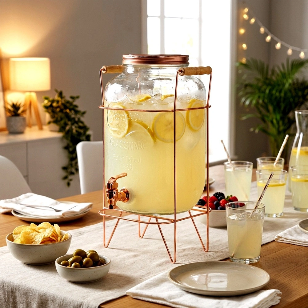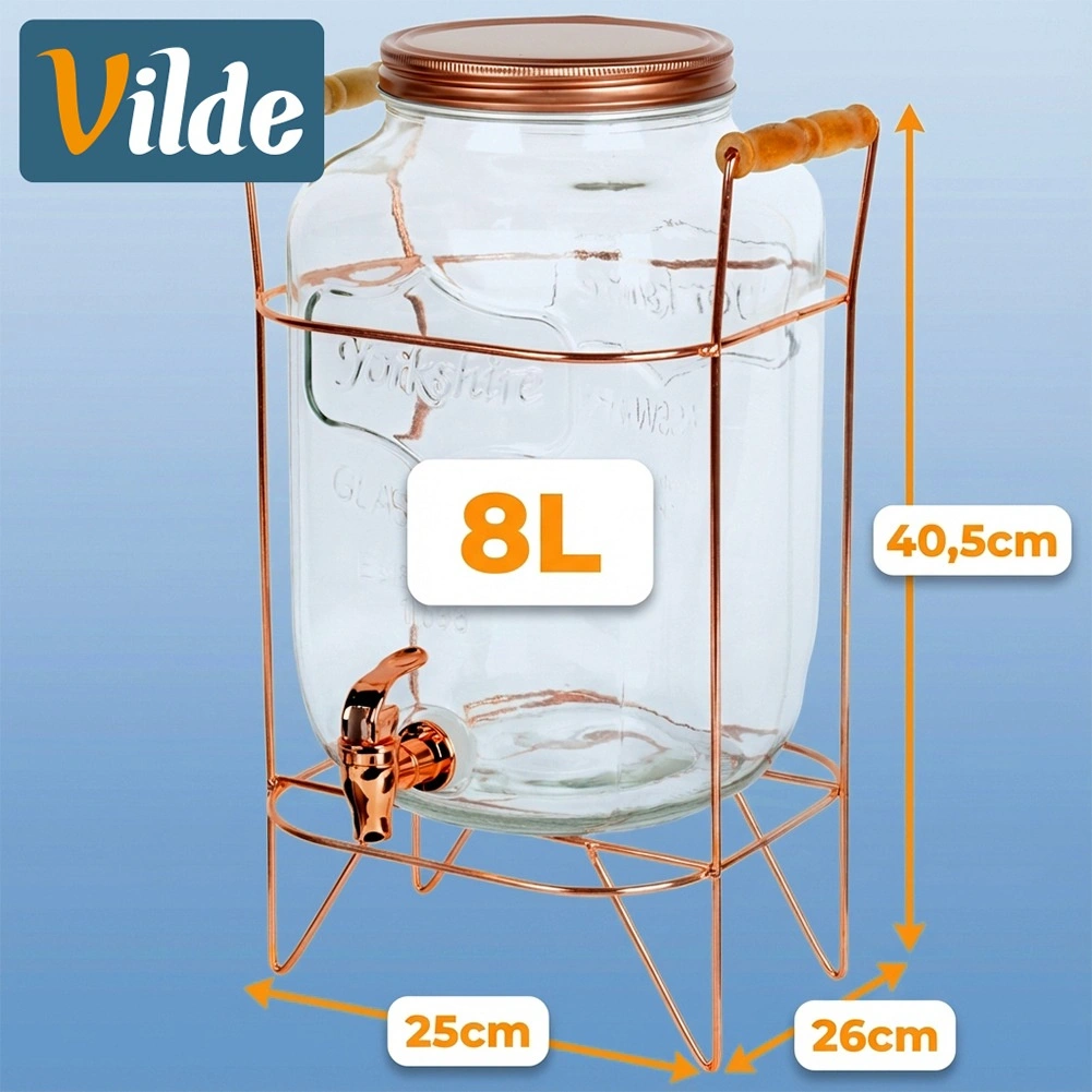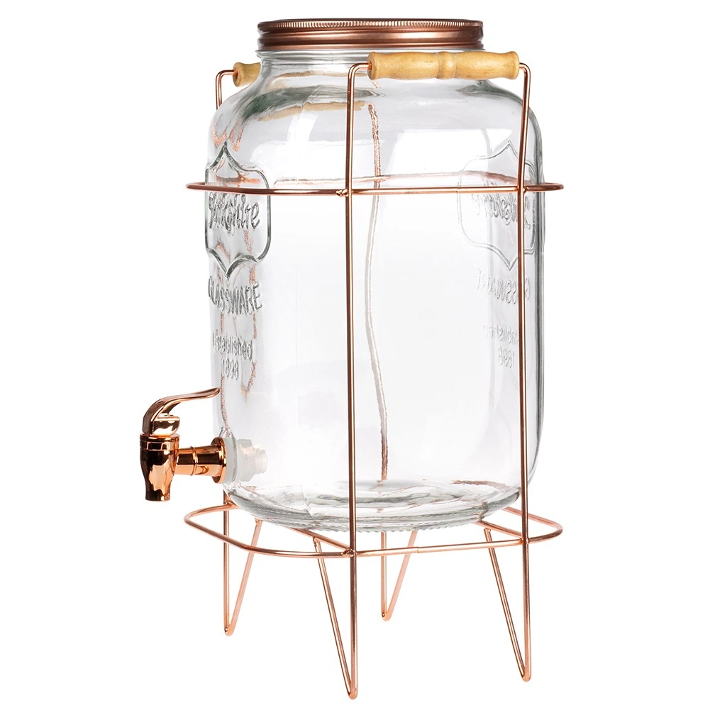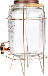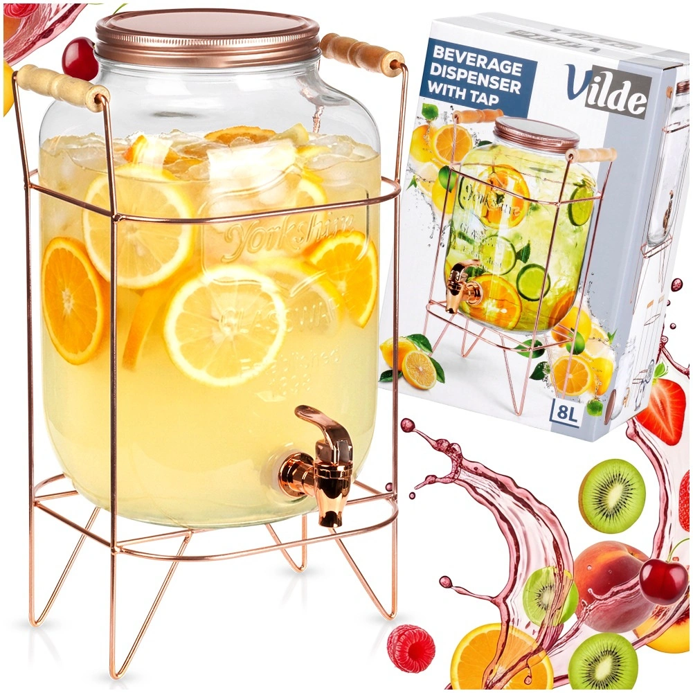 Stílusos, 8 l űrtartalmú üveg italadagoló stabil, rózsaarany színű fém állvánnyal, ideális limonádé, puncs vagy jeges tea felszolgálásához. A széles nyaknak köszönhetően könnyen tölthető gyümölccsel és jéggel, a praktikus csap kényelmes kitöltést biztosít, a csavaros fedél pedig megvédi a tartalmat a szennyeződésektől és rovaroktól. A masszív üveg, az elegáns dizájn és az állványon lévő kényelmes fa fogantyúk tökéletes választássá teszik ezt az adagolót kerti partikra és otthoni ünnepségekre is.