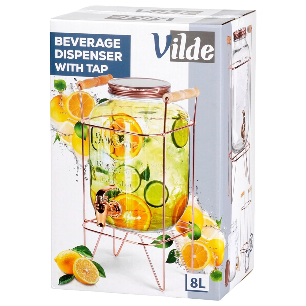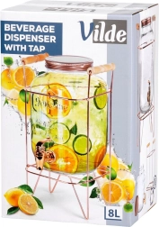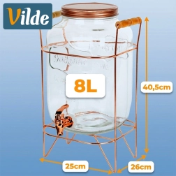 Az 8 l űrtartalmú üveg italadagoló kiváló családi ünnepségekre, grillezéshez és vendéglátóhelyekre. A megemelt állvány kényelmes kitöltést tesz lehetővé a poharakba, a tömítéssel ellátott csap egyenletes folyást biztosít, a csavaros fedél pedig tisztán és frissen tartja az italt. Az átlátszó üveg dombornyomott felirattal kiemeli a limonádék és gyümölcsitalok színét.