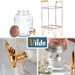 A szett tartalma: üveg kancsó/adalogoló, fém állvány és rózsaarany színű fém csavaros fedél. Alkalmas vízhez, házi limonádékhoz, ízesített vizekhez, gyümölcslevekhez, jeges teákhoz és puncsokhoz. Tökéletes a kertbe, teraszra és beltérre is.