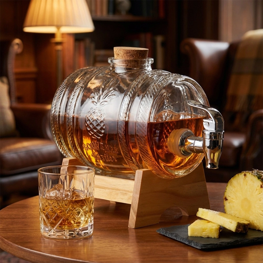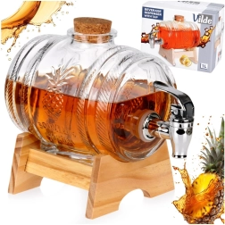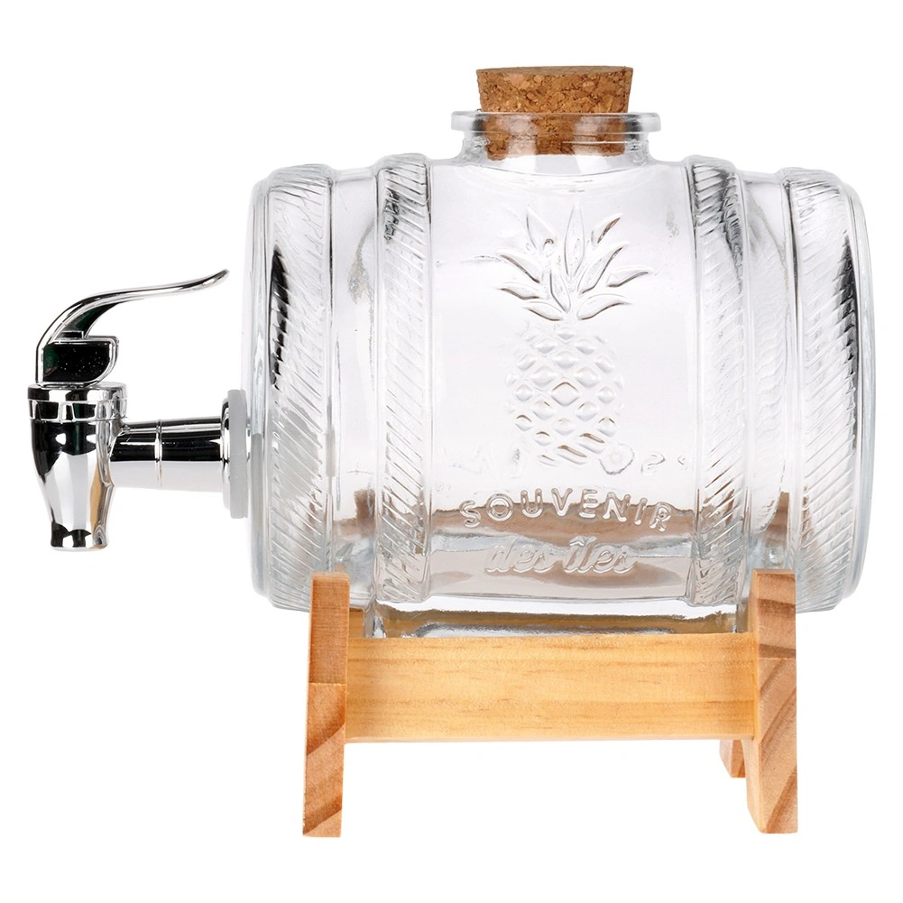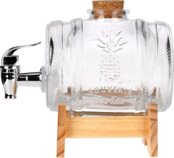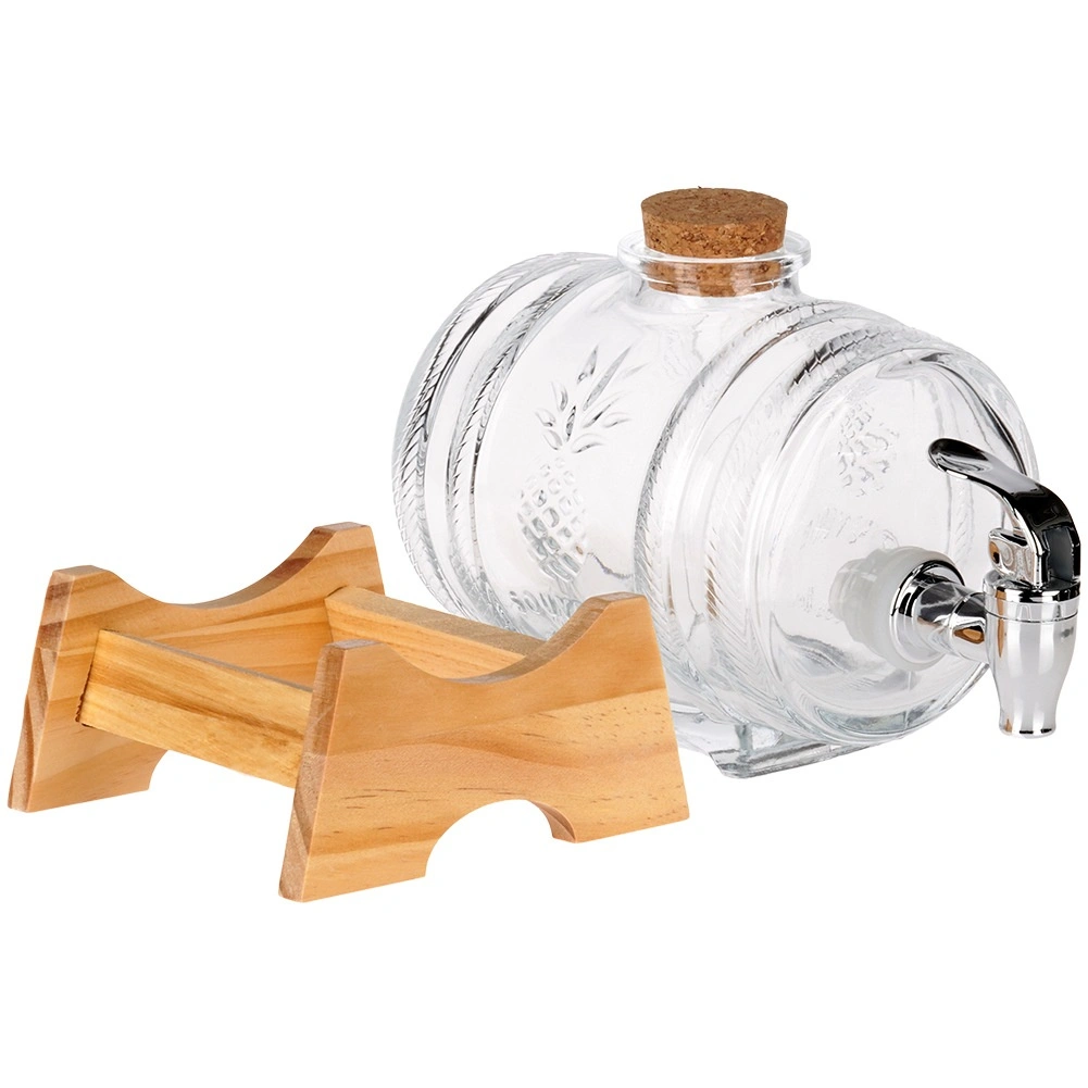 Stílusos, 1 literes üveg italadagoló fa állvánnyal és fém csappal, ideális limonádé, gyümölcslé, házi borok és likőrök szervírozásához. A hordó formájú kialakítás, a ananászmintás domborított dekor és a természetes parafadugós zár minden terítéken figyelemfelkeltő. A stabil állvány kényelmes töltést biztosít, a praktikus, tömítéssel ellátott csap pedig megkönnyíti a használatot.