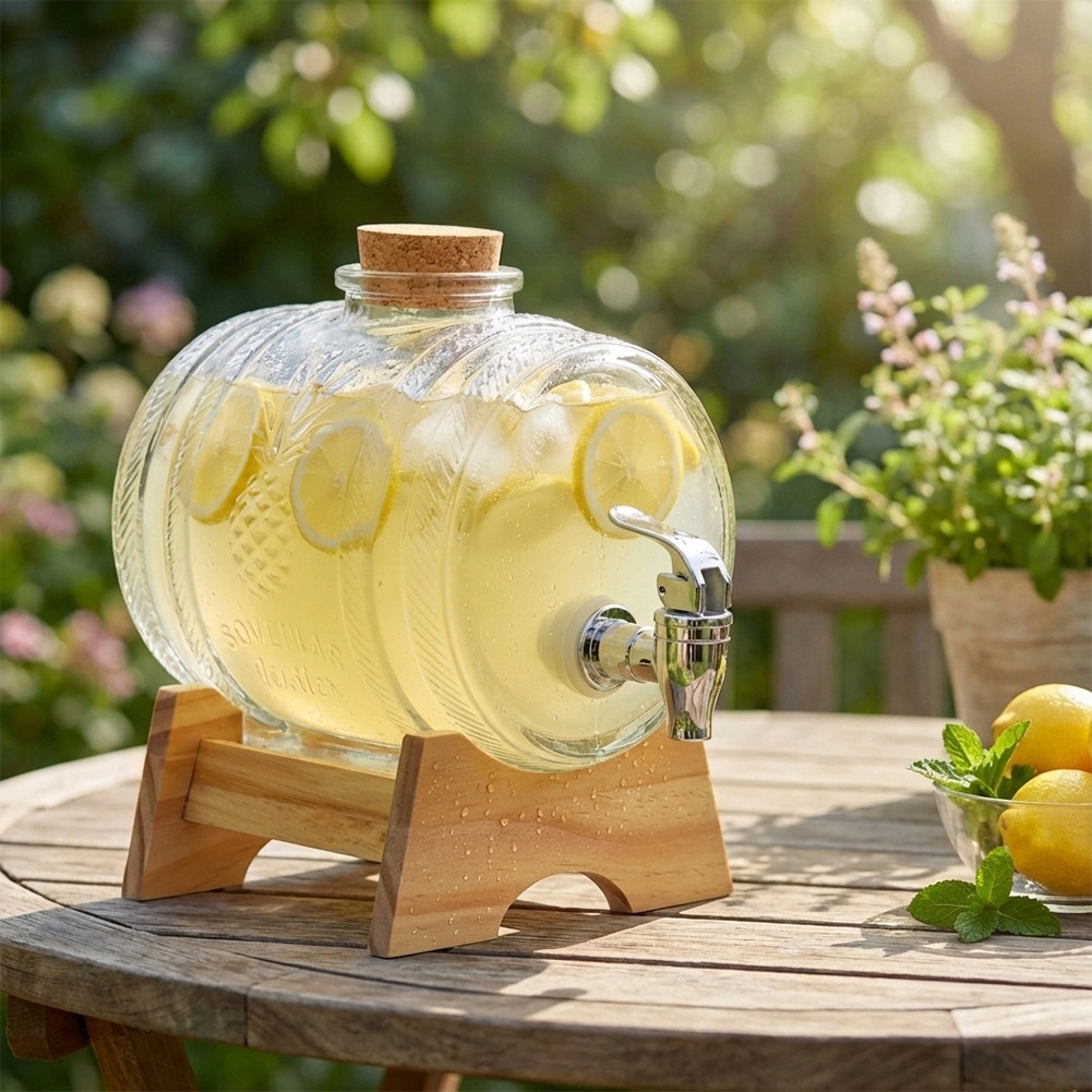 Az elegáns italadagoló vastag, minőségi üvegből készült, amely ötvözi a látványos dizájnt a praktikus használattal. A hordóforma dombornyomott gyümölcsmintával és a természetes parafa védi az italt a rovaroktól. Kiváló választás kerti partikra, családi ünnepekre és stílusos büféasztalokhoz.