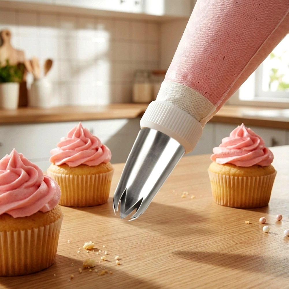 A cső éles kivágásai tiszta csillagvonalakat és légies krémvirágokat formáznak tortákon és cupcake-eken.