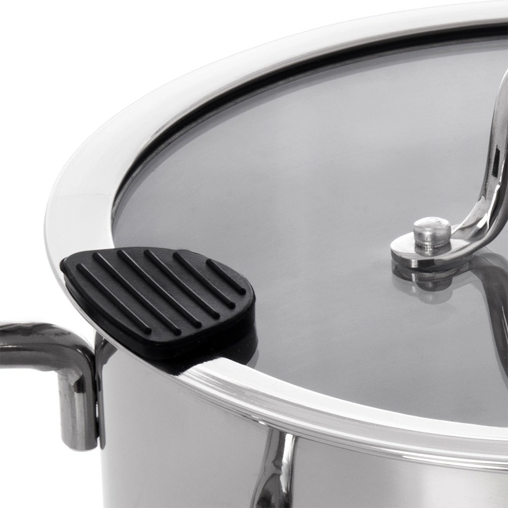 Az edzett üveg fedő beépített szűrőréssel és szilikon elemekkel rendelkezik a biztos fogásért. Könnyedén leöntheti a tészta vagy zöldség levét további eszközök nélkül.