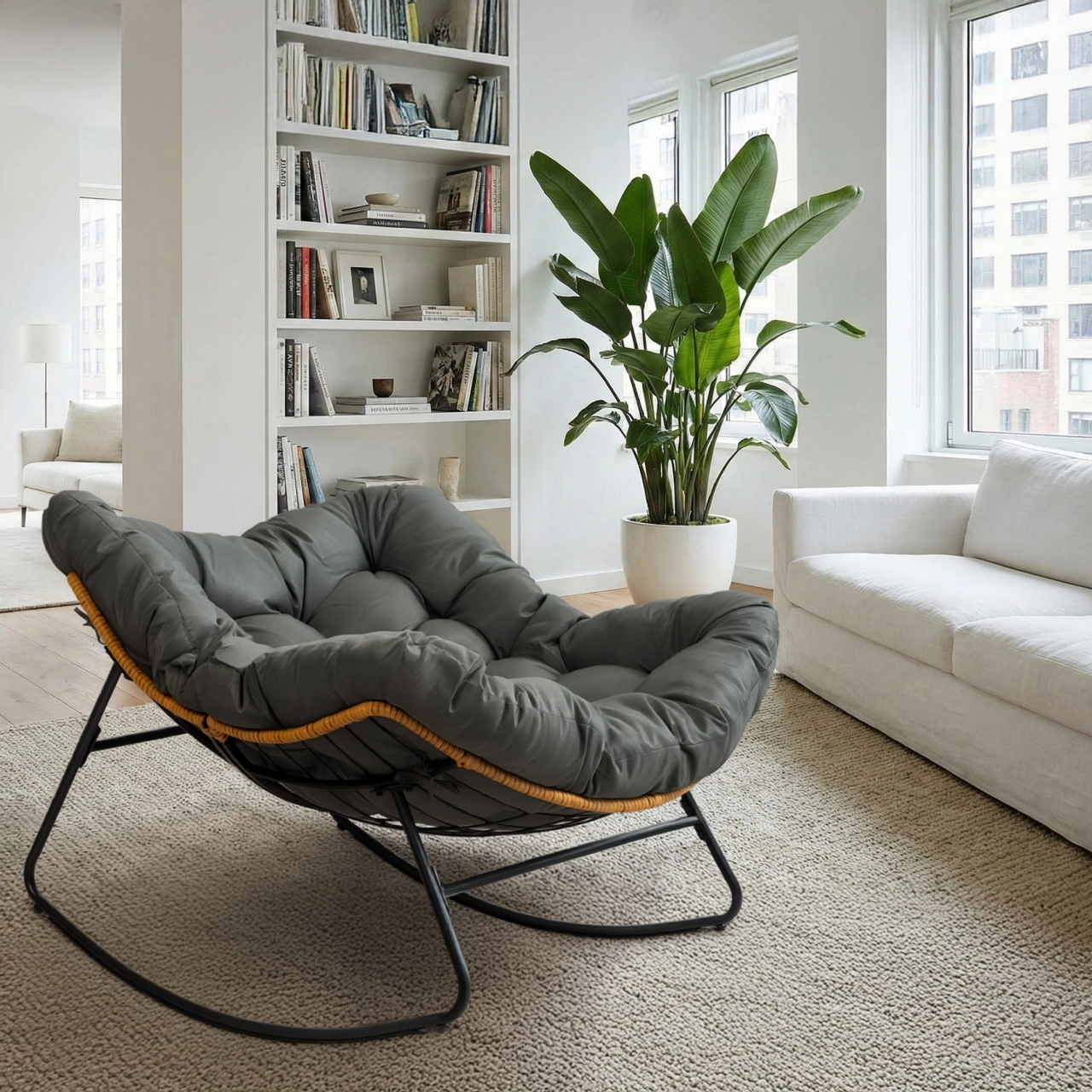 Alakíts ki otthon saját relax zónát. Ez az XL hintaszék mély és tágas ülőfelületet, puha, steppelt párnát és finom ringató mozgást kínál, amely segít ellazítani a testet és az elmét. A semleges szürke könnyen illeszkedik a fához, fekete fémhez és természetes kiegészítőkhöz, a levegős kialakításnak köszönhetően pedig kisebb helyiségekben sem hat nehézkesnek.