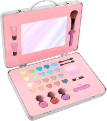 Ez a kozmetikai készlet minden kislány álma. Minden szükséges dolgot biztosít a gyönyörű smink elkészítéséhez, közvetlenül otthoni kényelemben. A stílusos bőrönd tartalma:
