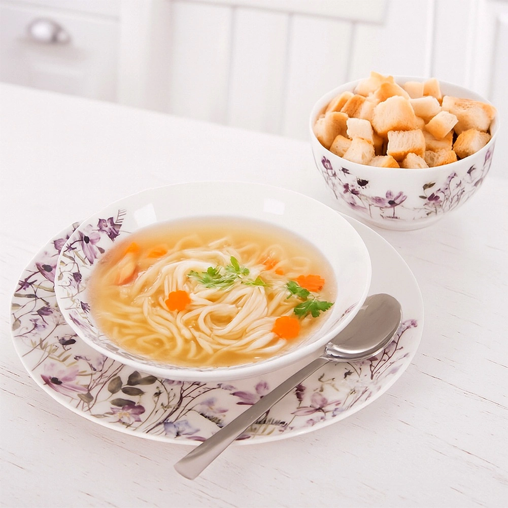 A fehér porcelánon megjelenő finom botanikai minta ünnepélyes pillanattá varázsol minden étkezést, és remekül harmonizál a természetes kiegészítőkkel.