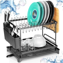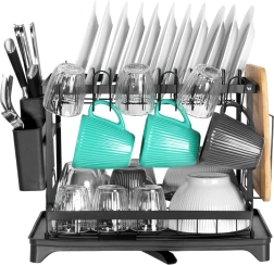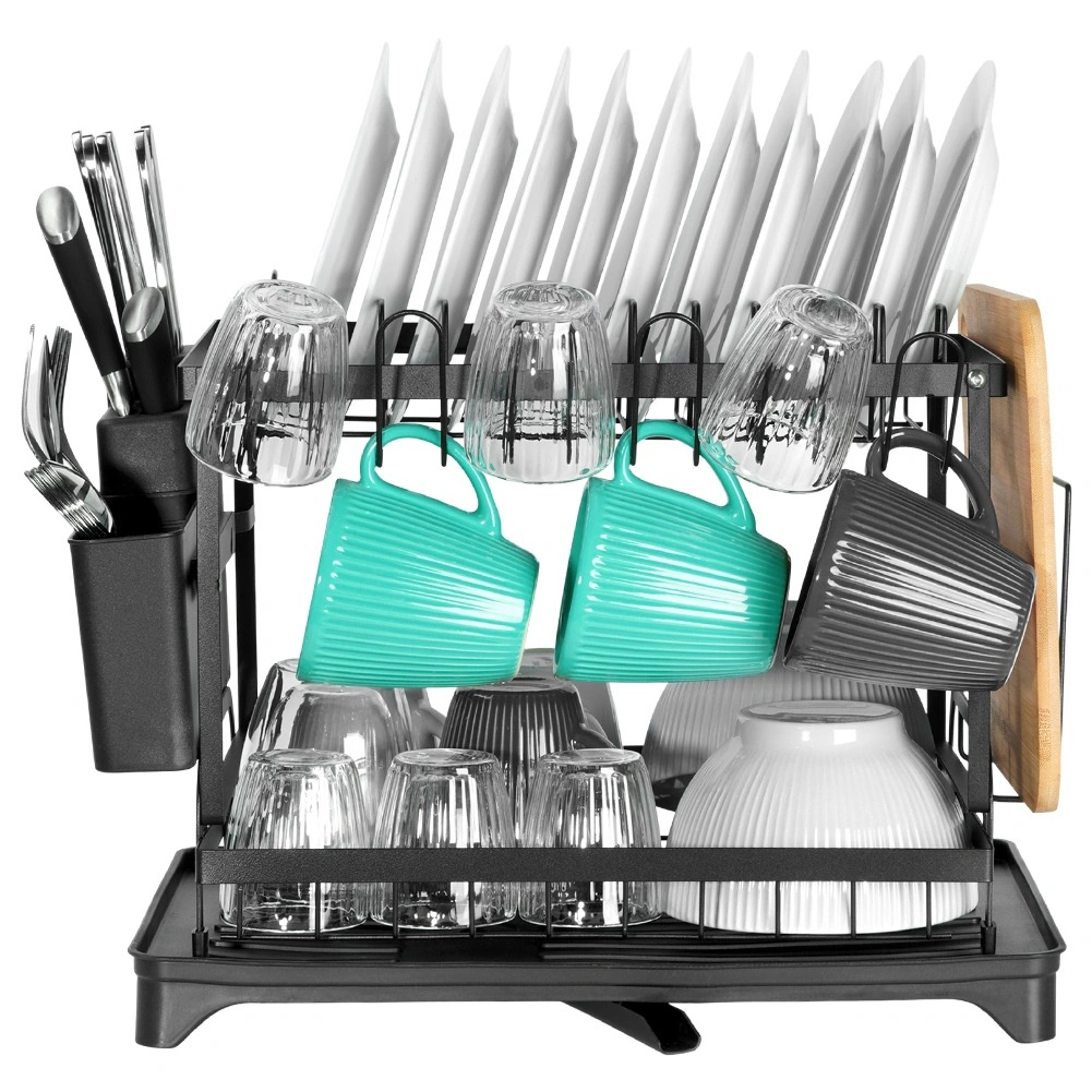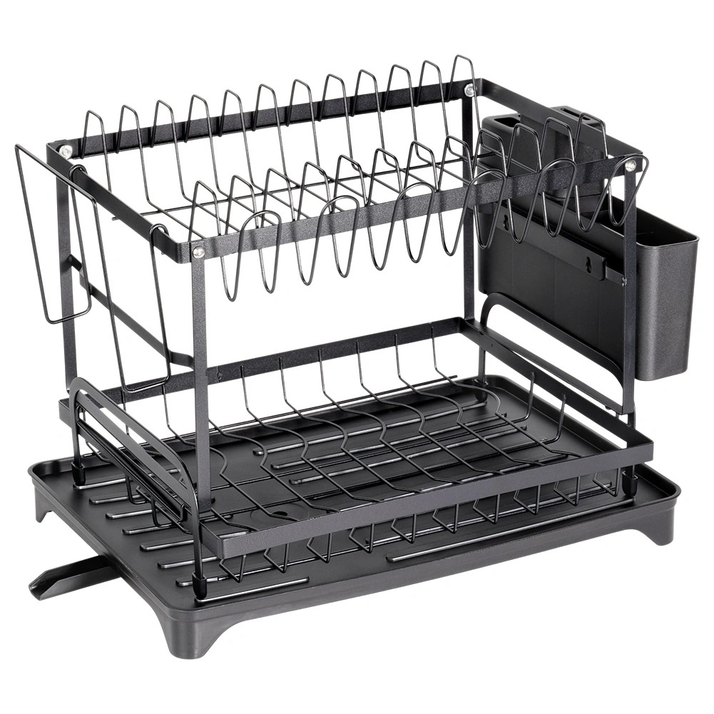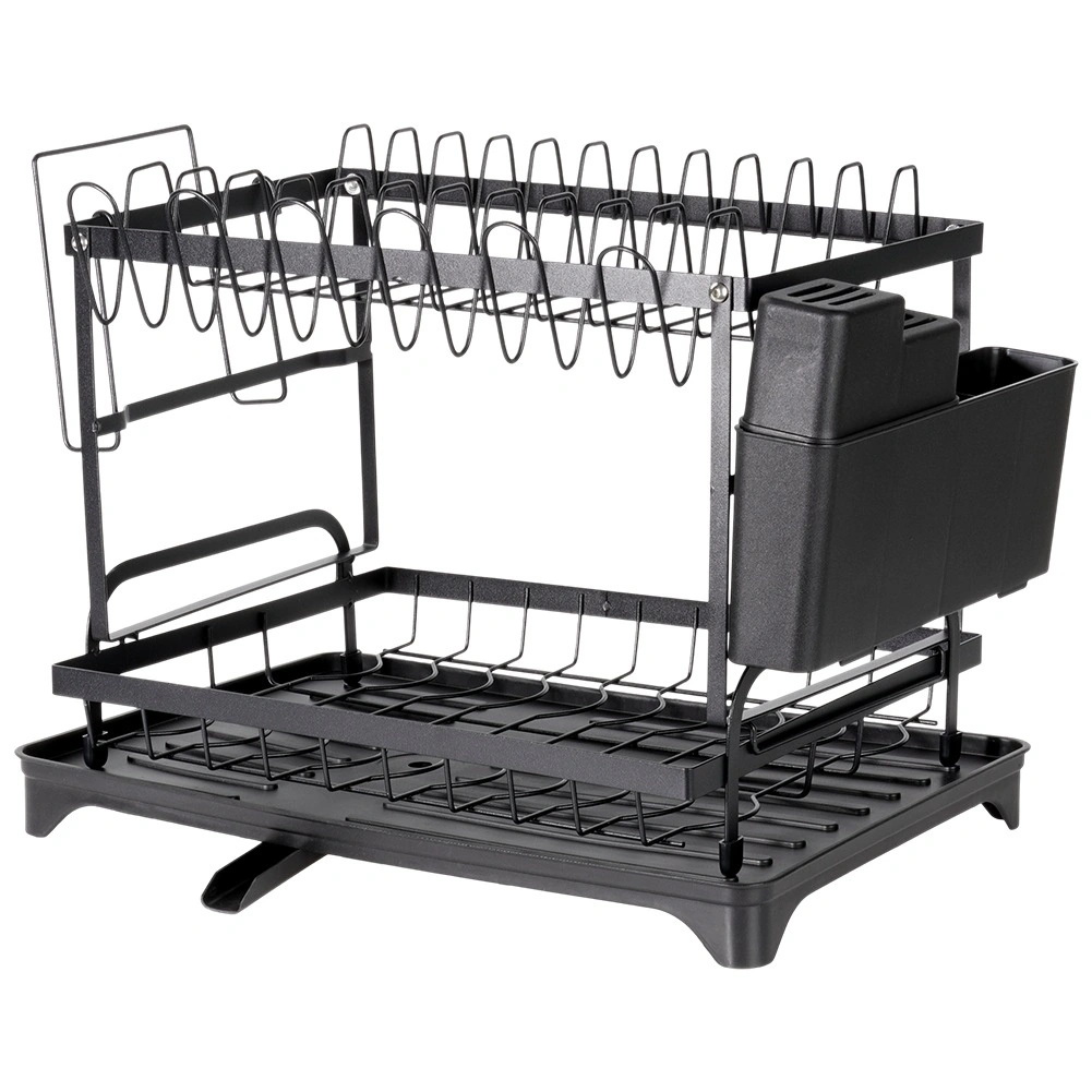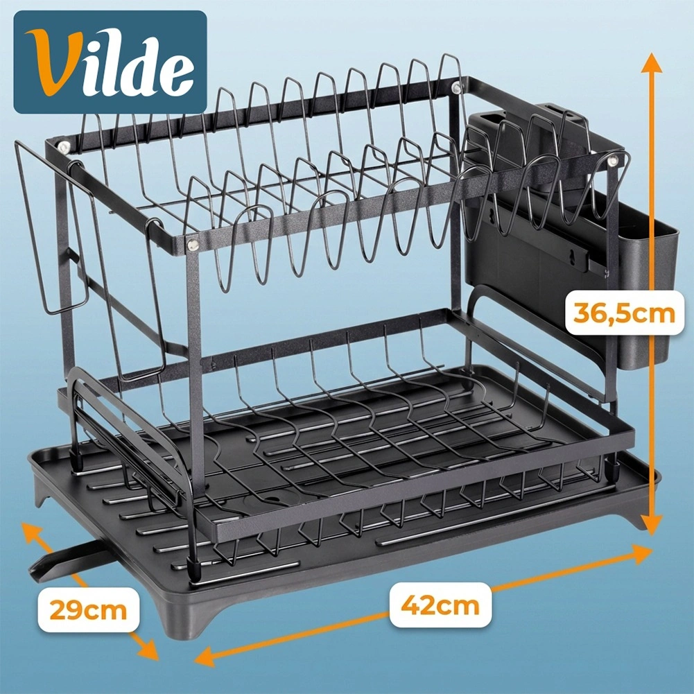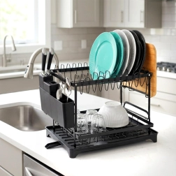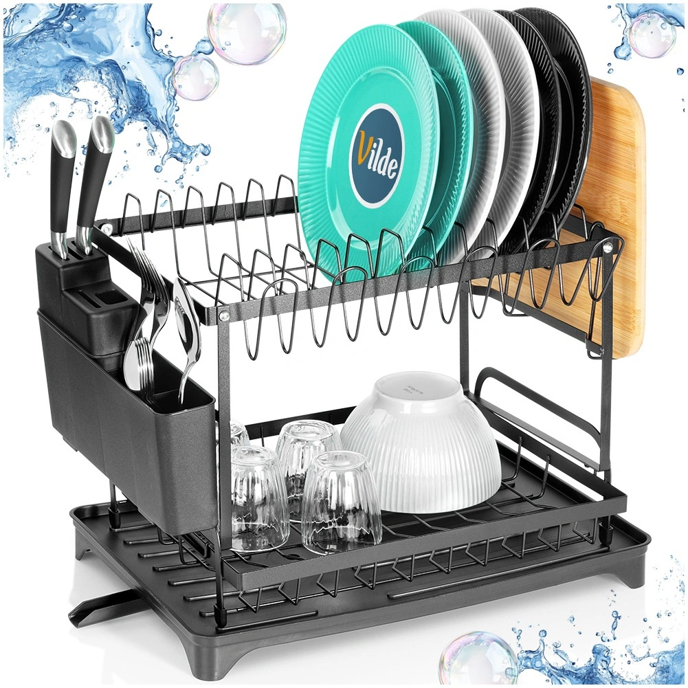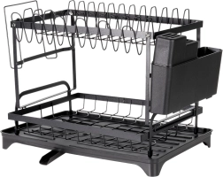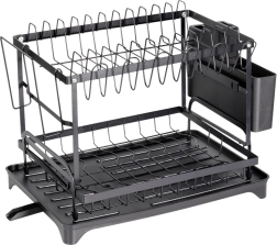 Elegáns és tartós, kétszintes, matt fekete fém edényszárító nagy kapacitással és átgondolt elrendezéssel. A felső szint akár 11 tányért fogad, az alsó pedig tálaknak, bögréknek és poharaknak ideális. Tartozék a levehető evőeszköztartó 4 rekesszel (egy a késeknek), oldalsó vágódeszka-tartó és kifolyós tálca az irányított vízelvezetéshez.