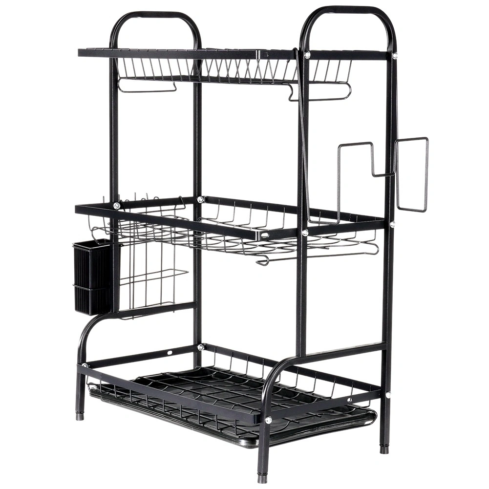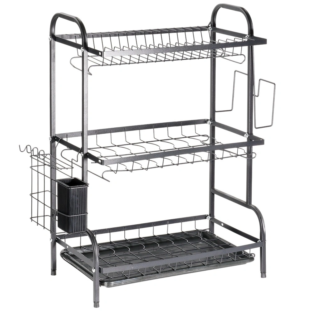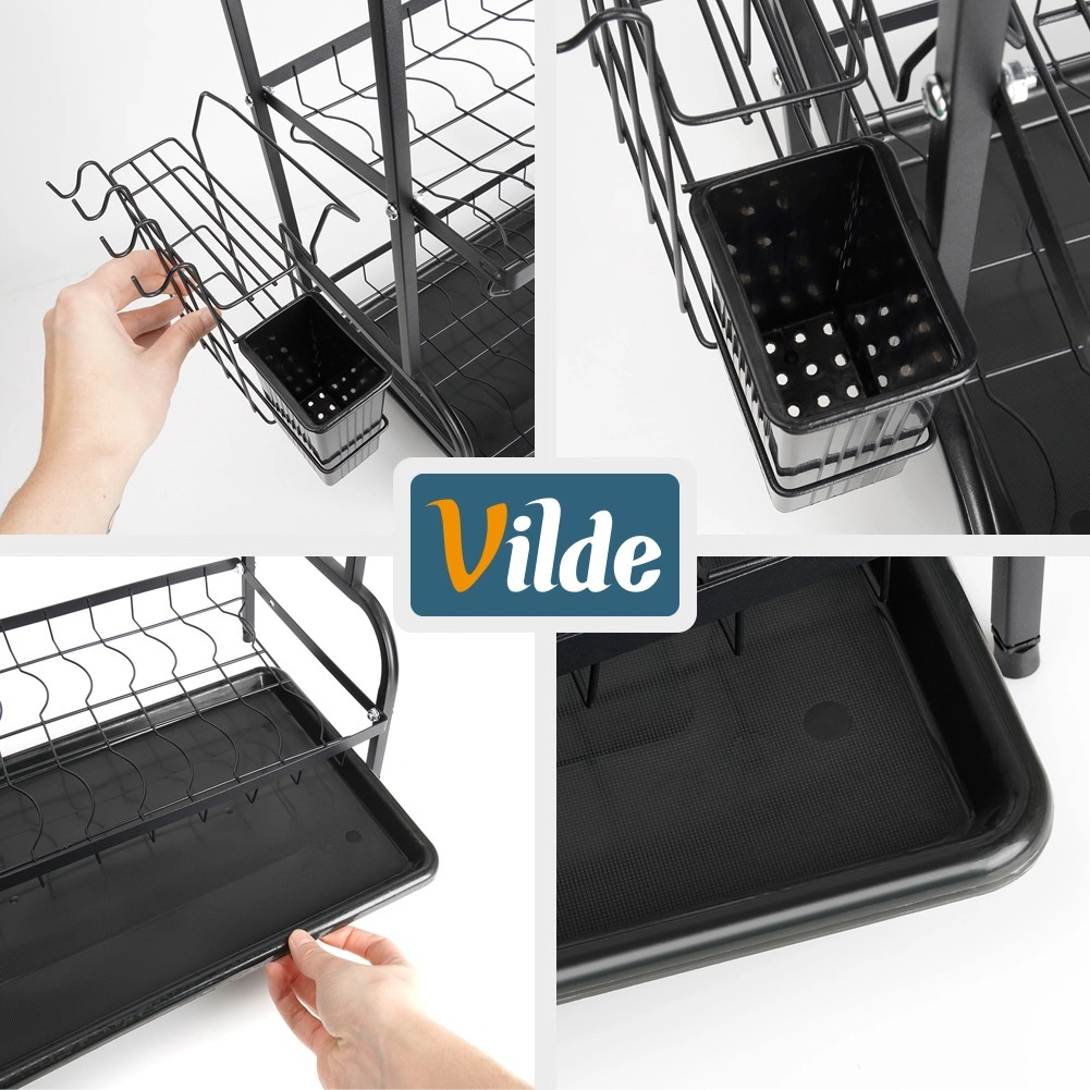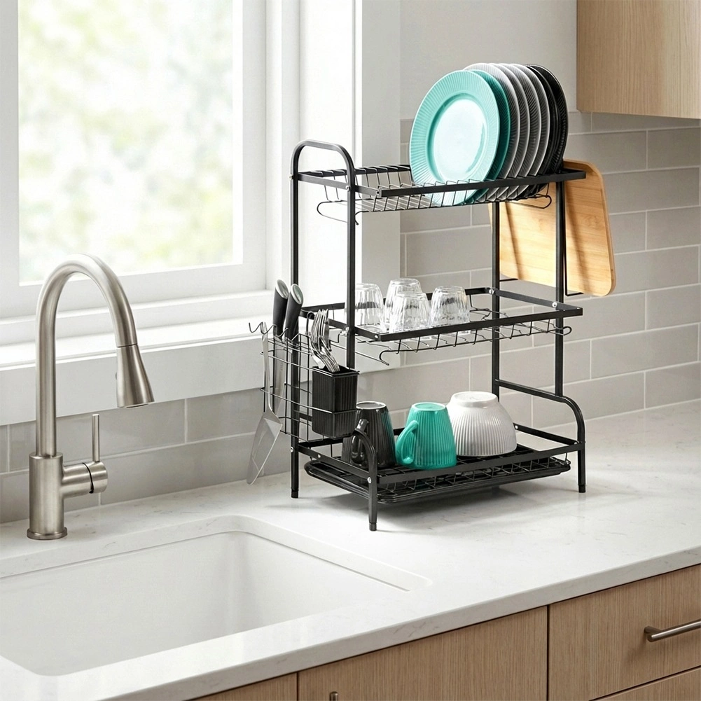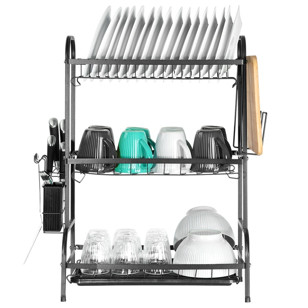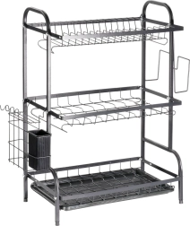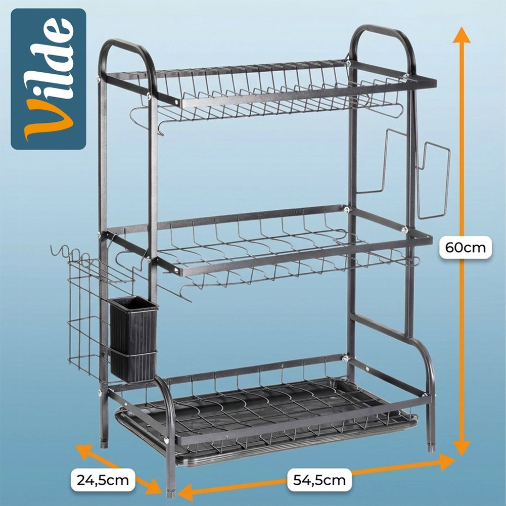 Maximalizálja a mosogató körüli teret a háromszintes, fekete, tartós fémből készült edényszárítóval. A felső szint akár 16 tányért is befogad, az alsó szintek pedig ideálisak tálak, poharak és bögrék számára. A levehető evőeszköztartó és az oldalsó vágódeszka-tartó bővíti a szárítófelületet, míg a kivehető csepegtetőtálca felfogja a vizet és szárazon tartja a munkalapot.
