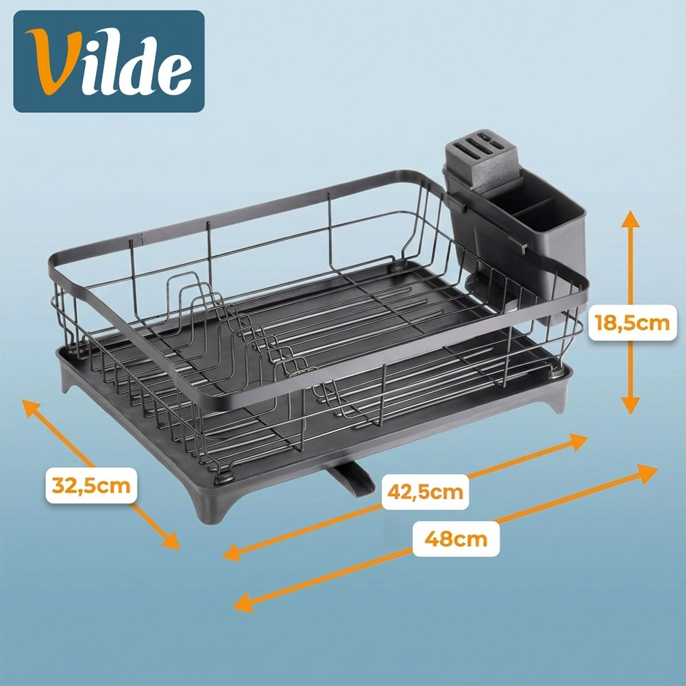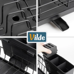 A tálcába integrált kiöntőnyílás irányított vízelvezetést biztosít közvetlenül a mosogatóba, így a munkafelület nem marad vizes. Az edényszárító bármely konyhába illik – a moderntől a klasszikusig – és a könnyű karbantartásnak köszönhetően nap mint nap időt takarít meg. Eredeti VILDE termék, európai szabványok szerint gyártva.
