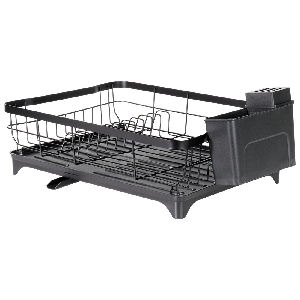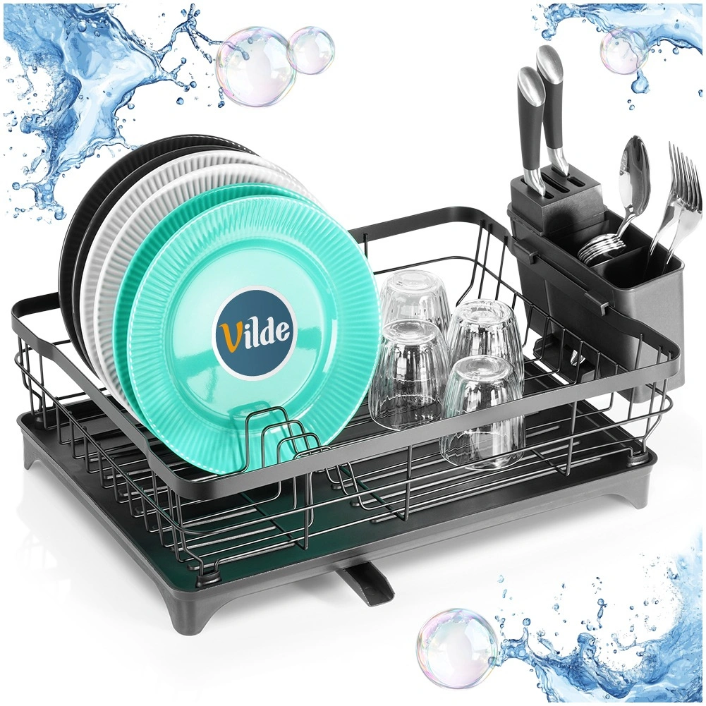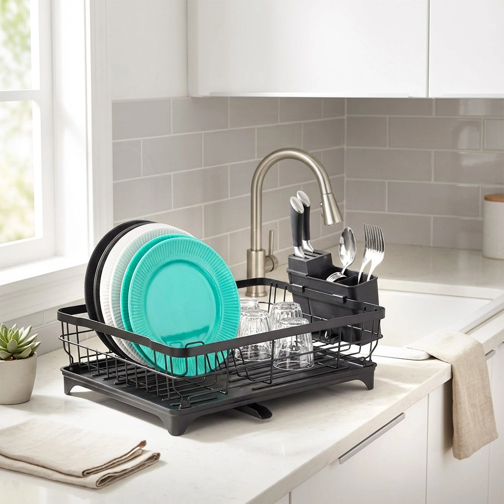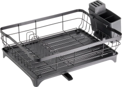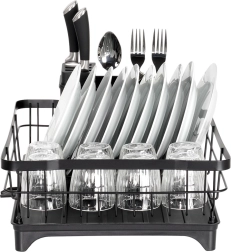Az edényszárító a funkcionalitást és a stílusos dizájnt ötvözi. A fekete színű rozsdamentes fém huzalszerkezet és a minőségi műanyag csepegtetőtálca könnyen tisztítható és hosszú élettartamú. Átgondolt elrendezésének köszönhetően elférnek benne tányérok, poharak és tálak, míg a háromrekeszes tartó az evőeszközöket áttekinthetően különválasztva tartja.