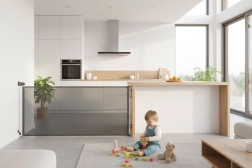 A feltekerő mechanizmus rögzítő zárral lehetővé teszi a finom kihúzást és a kívánt hossz biztonságos rögzítését. A kapu egy kézzel nyitható és zárható, így a mindennapi teendők közben is rugalmas marad. Összehúzva visszafogott, és helytakarékos a modern enteriőrökben.