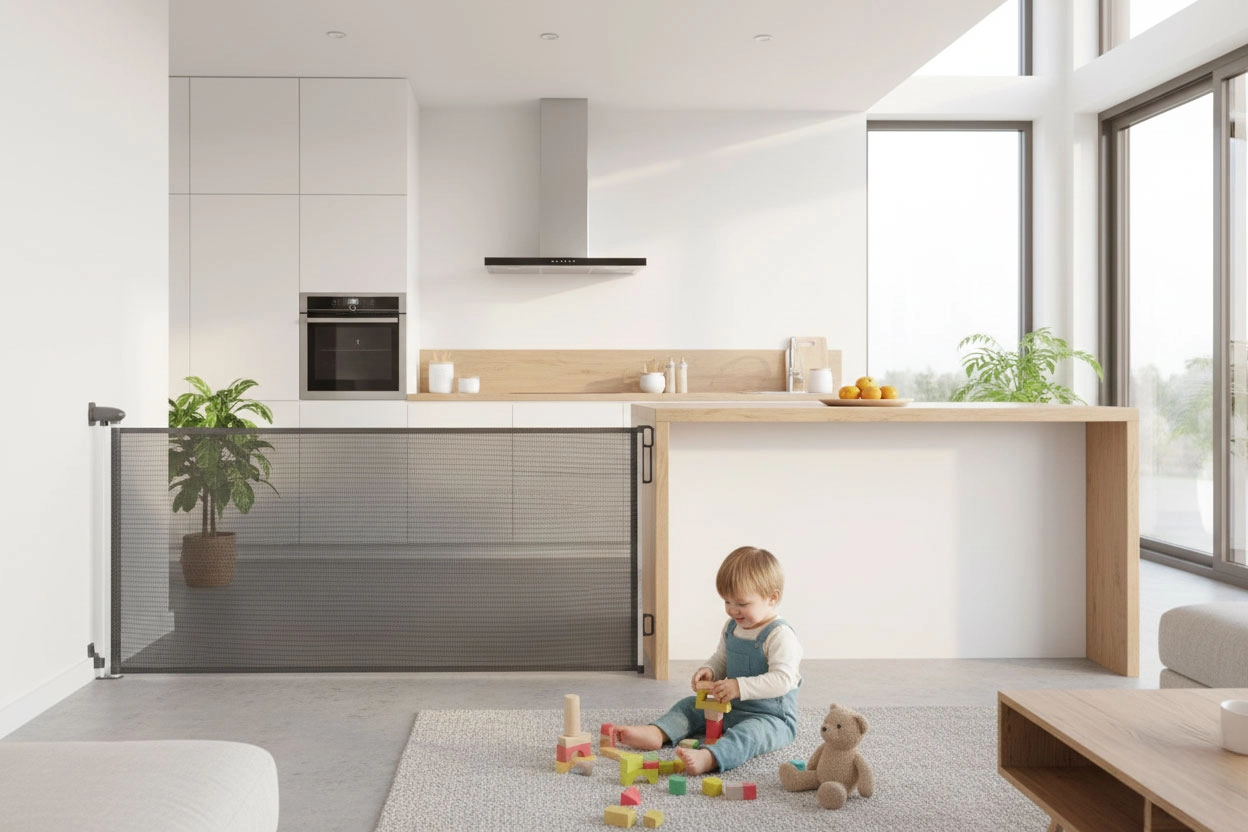Az ECOTOYS kihúzható kapu megbízható megoldás a hozzáférés korlátozására lépcsőkhöz, konyhához vagy műszaki helyiségekhez. A sűrű szövésű PVC háló jó láthatóságot és légáramlást biztosít, ugyanakkor masszív fizikai akadályt képez a kisgyermekek és a háziállatok számára.