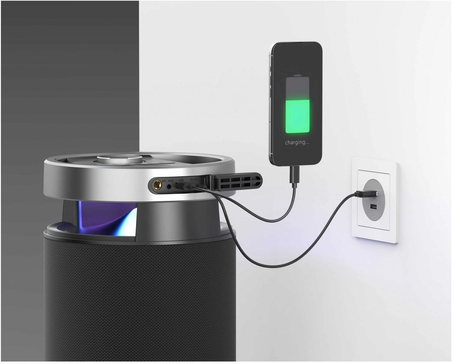A vezeték nélküli kapcsolat gyors és stabil, kényelmessé téve a zene streamelését telefonról vagy tabletről. A több móddal rendelkező LED világítás megteremti a hangulatot, a felső panel vezérlői pedig egyszerű kezelést biztosítanak a hangerő, a lejátszás és a fényüzemmódok felett. A textilrácsos, fém gyűrűs, masszív ház elegáns és tartós.