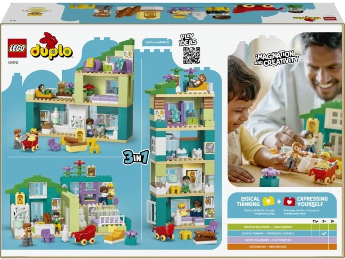 Fedezd fel a sokoldalú LEGO DUPLO modern családi ház 3 az 1-ben készletet 166 elemmel, 2 éves kortól. A gyerekek 3 különböző házmodellt építhetnek – egyszintes lakást, háromszintes házat vagy ötszintes házat tetőkerttel. A készlethez 4 családi figura és számos kiegészítő (babakocsi, hűtőszekrény, toalett stb.) tartozik, amelyek támogatják a kreatív játékot, a finommotorika és a szociális készségek fejlődését.