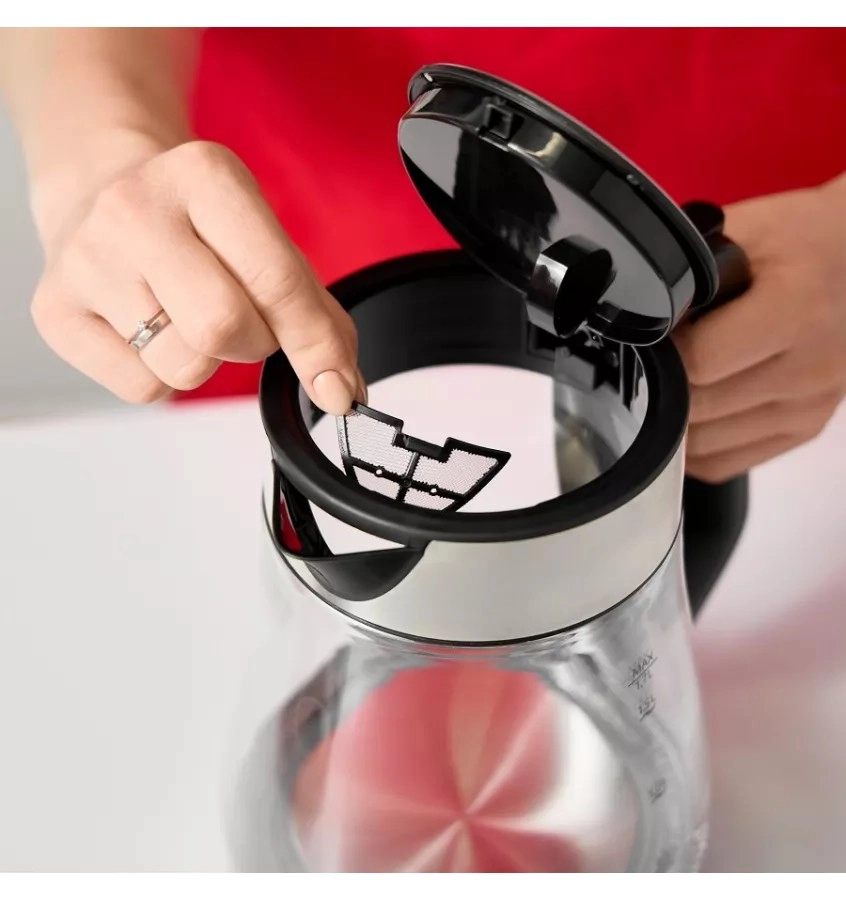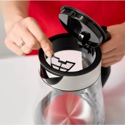 A tartós boroszilikát üveg és a rozsdamentes acél elegáns megjelenést, hosszú élettartamot és könnyű karbantartást biztosít. A praktikus automatikus fedél egy gombnyomással nyitható, míg a cserélhető szűrő felfogja a lerakódásokat és szennyeződéseket a tisztább vízízekért.