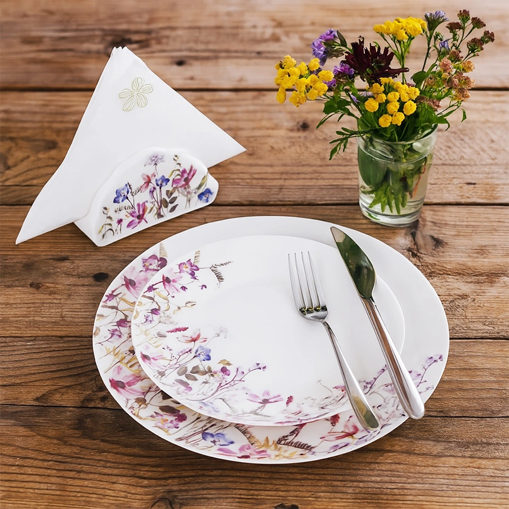 Fehér porcelán pasztellszínű mezei virágmotívummal, amely bájt és frissességet kölcsönöz a terítéknek – remekül illik modern és rusztikus enteriőrökhöz egyaránt.