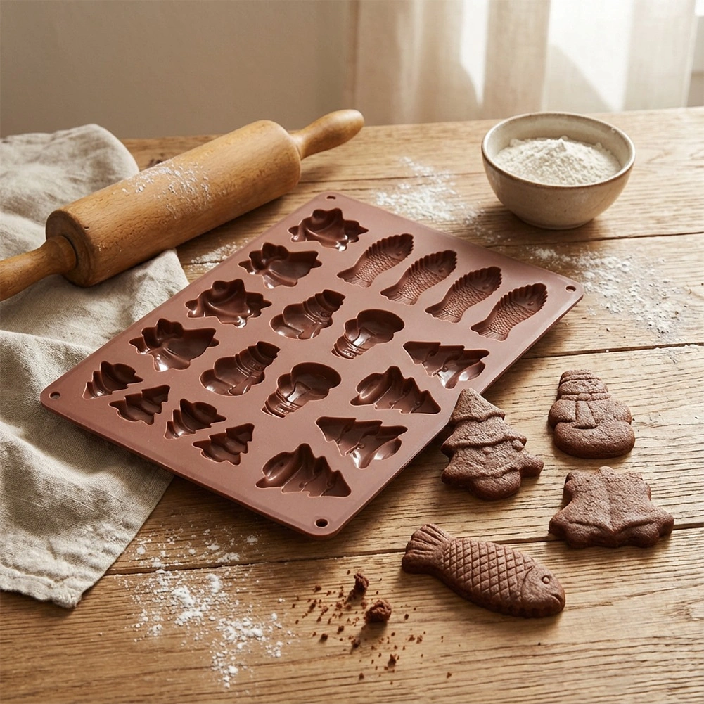 Ez a barna szilikon forma ideális finom kekszek, mézeskalácsok, pralinék és házi csokoládék készítéséhez. A rugalmas, tapadásmentes felületnek köszönhetően a kész darabok könnyen kiemelhetők vajazás vagy lisztezés nélkül. A forma nem veszi át a szagokat és ízeket, és helytakarékos a konyhában.