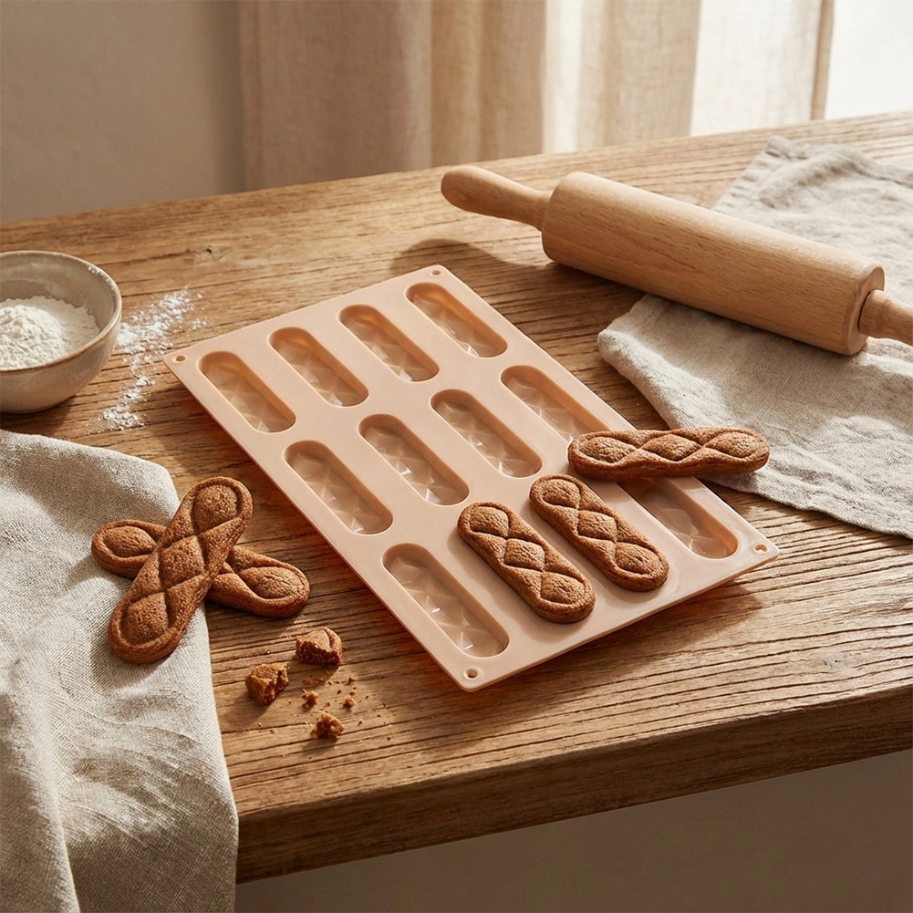 Ez a bézs szilikon forma 12 hosszanti mélyedéssel (egyenként kb. 8 × 2 × 1 cm) ideális vaníliás, kakaós vagy diós kekszekhez, rudakhoz és házi pralinékhoz. A rugalmas szilikonnak köszönhetően a sütemény a sütés után könnyen kiemelhető, és megőrzi egységes formáját, vonzó textúrával.