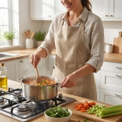 Az univerzális szabás és a kellemes, természetes anyag kényelmet nyújt a mindennapi főzéshez, sütéshez és kreatív tevékenységekhez. Az egyszerű karbantartás, 40 °C-ig történő gépi mosással, megkönnyíti a hosszú távú használatot és a tisztán tartást.