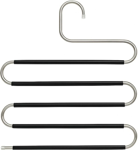 A praktikus S alakú vállfa masszív fémet kombinál tartós gumírozott felülettel, amely megakadályozza a lecsúszást és védi a szöveteket. Az öt fok mindegyikére kényelmesen felakaszthatod a nadrágokat, sálakat, szoknyákat és egyéb textíliákat. Az elegáns ezüst–fekete kivitel illik bármely gardrób belsőhöz.