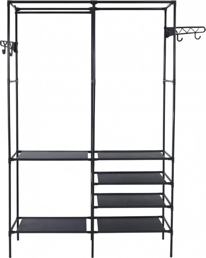 Maximalizálja a tárolóhelyet ezzel az elegáns fekete ruhafogassal, amely a stabil fém szerkezetet és a praktikus textil polcokat ötvözi. A magas rész a hosszú kabátok és dzsekik számára készült, míg az alsó polcok elférnek cipőknek, táskáknak vagy dobozoknak. A könnyű, speciális szerszámot nem igénylő szerelésnek köszönhetően pillanatok alatt összeállítható.