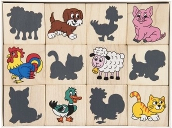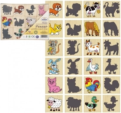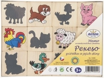 Pexeso fából készült kártyákkal, állatkákkal és azok árnyaival nyomtatva. Szórakoztató módon segíti a gyermekek képzeletét és memóriáját fejleszteni.
