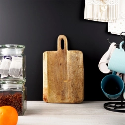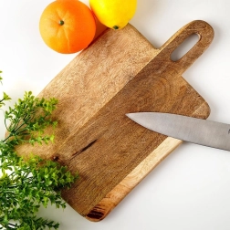 Fedezze fel a funkcionalitás és a design találkozását: a rusztikus stílusú mangófa deszka kiváló választás az ételek előkészítéséhez és tálalásához egyaránt. A fa természetes erezete és a finoman lekerekített élek kényelmes és biztonságos használatot biztosítanak, míg az integrált, nyílással ellátott fogantyú megkönnyíti a hordozást és az akasztást.