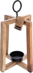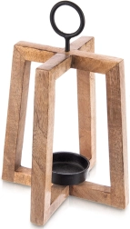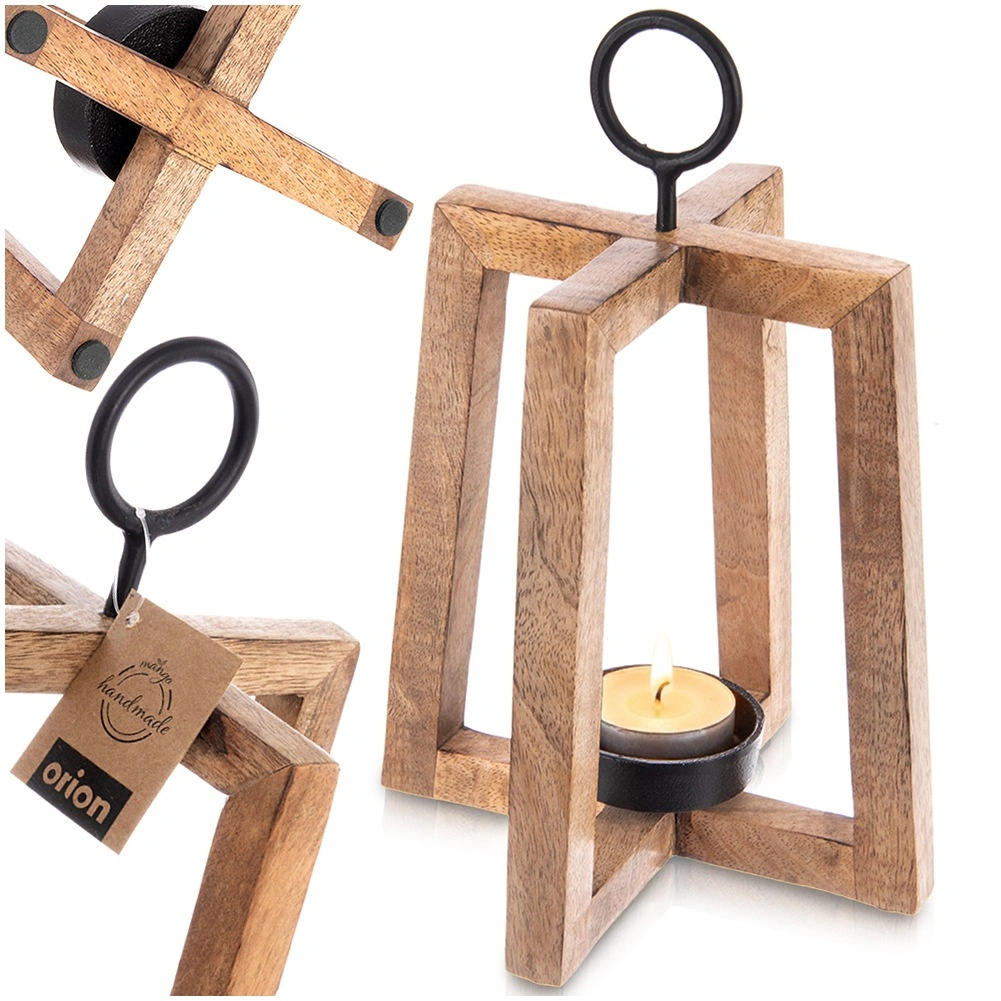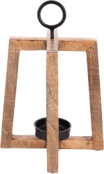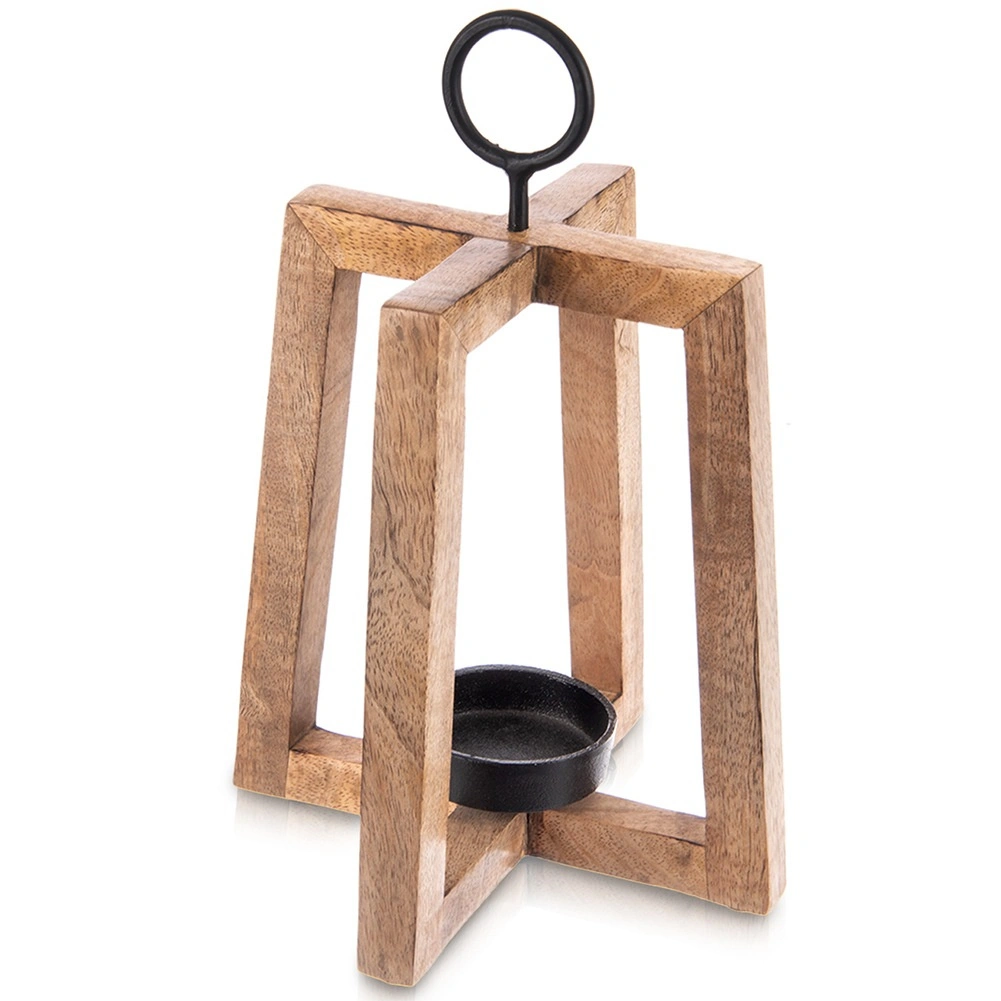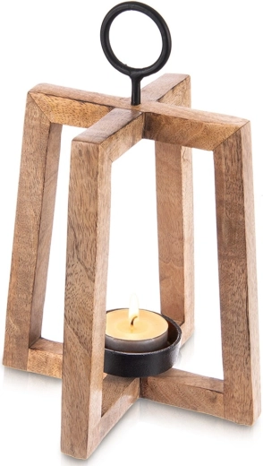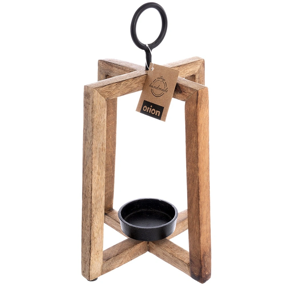 Stílusos mangófából készült fa gyertyatartó nyitott kialakítással, amely kellemes, hangulatos fényt biztosít, és természetes bájt kölcsönöz a belső térnek és a terasznak. A fém fogantyú lehetővé teszi a felakasztást és a kényelmes hordozást, a fém tál biztonságosan tartja a gyertyát/tealightot 6 cm átmérőig, a filcpárnák pedig stabilitást és felületvédelmet nyújtanak. Méretek: 18 × 18 × 27,5 cm.