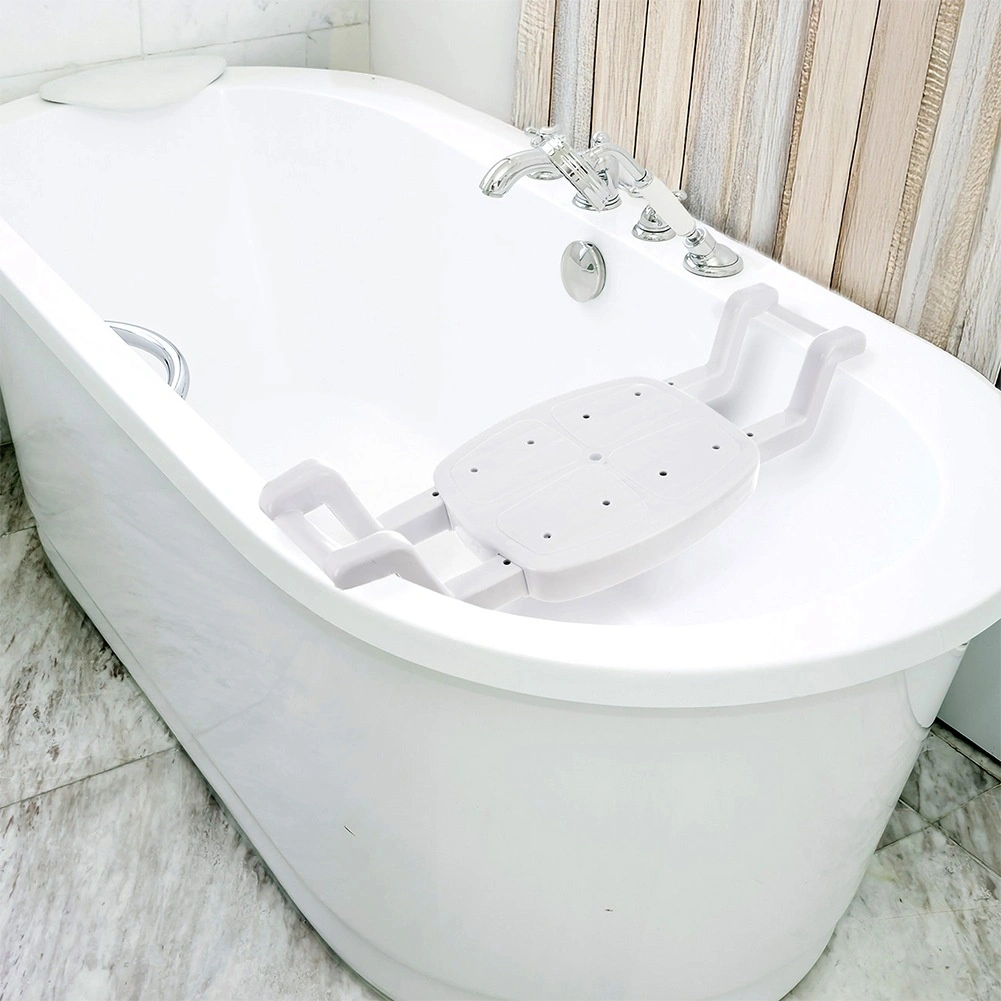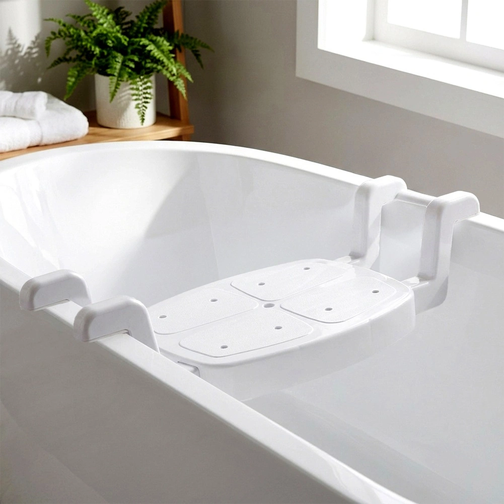 Az ergonomikusan formázott, 35,5 × 27,5 cm méretű ülőfelület vízelvezető perforációval minimalizálja a csúszásveszélyt és megkönnyíti a higiéniát. A felszerelés gyors és szerszámmentes – az ülőke biztonságosan a kád peremére támaszkodik, így biztos tartást nyújt az átszállásnál és a fürdés során is.