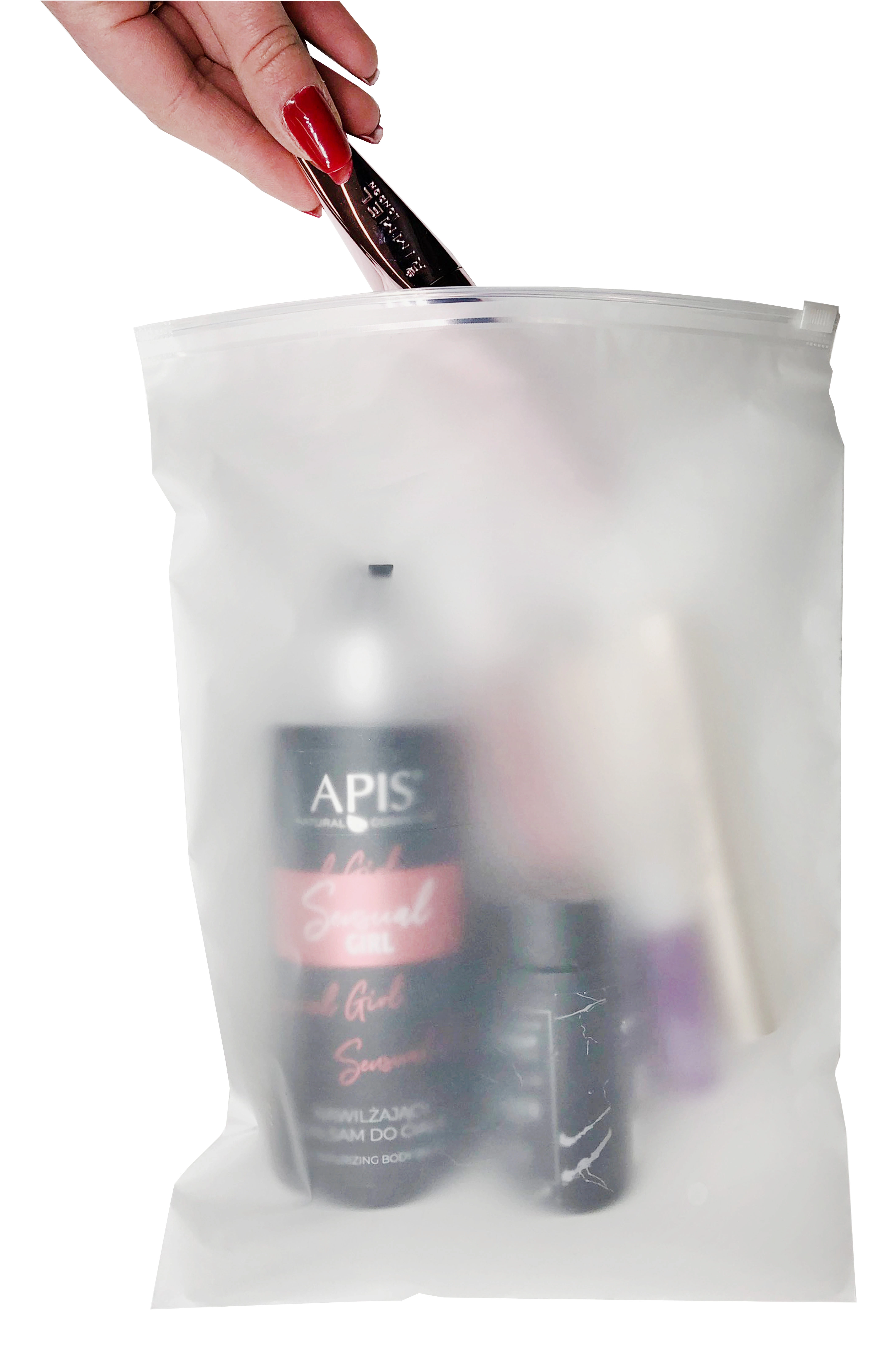 A fényes-matt tasakok egyben tartják az üvegcséket, tubusokat és ecseteket, megvédik azokat a nedvességtől és szennyeződésektől, és megkönnyítik az utazáshoz való csomagolást.