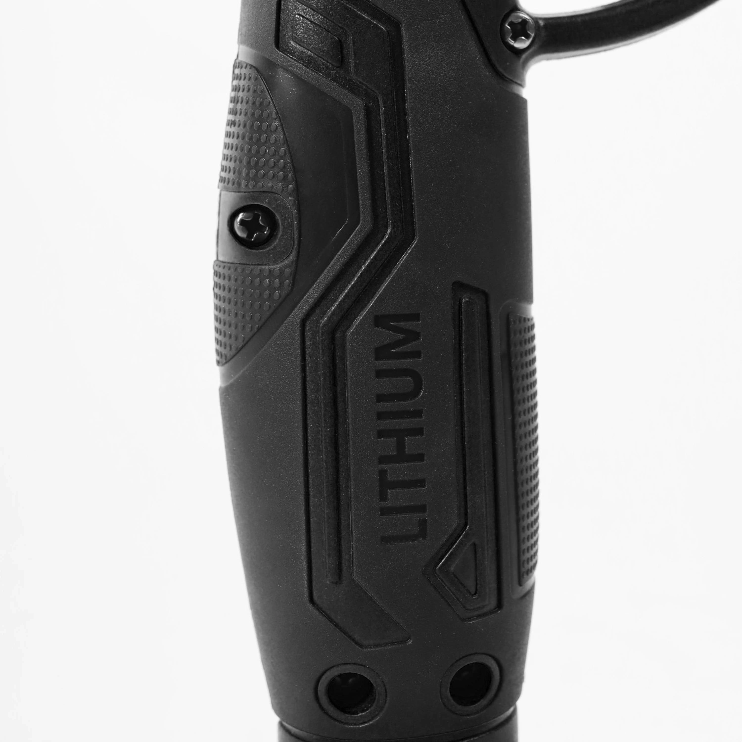 A kényelmes, csúszásmentes gumírozott markolat és a lítium-ion akkumulátor kiegyensúlyozott fogást és vezeték nélküli mozgásszabadságot biztosít.