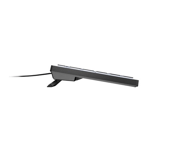 A kihajtható lábakkal könnyen beállítható a dőlésszög az ergonomikus gépelésért és a csukló kisebb terheléséért. A csúszásgátló betétek nagy tempónál is stabilan a helyén tartják a billentyűzetet. A 12 funkcióbillentyű felgyorsítja a mindennapi műveleteket – a számológép, a böngésző megnyitása vagy az asztal megjelenítése egy pillanat műve.